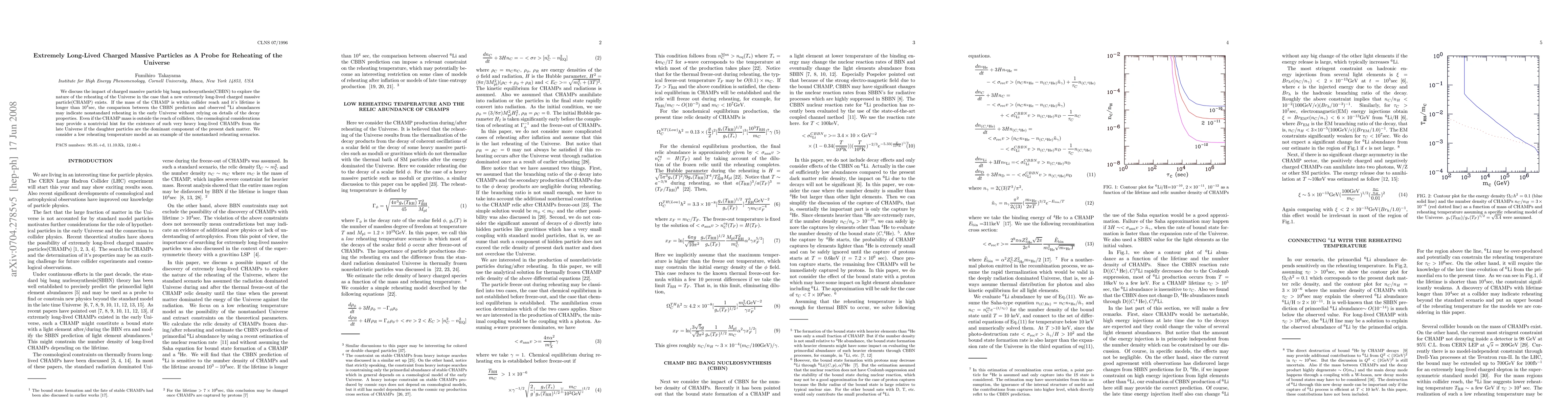 We discuss the impact of charged massive particle big bang nucleosynthesis(CBBN) to explore the nature of the reheating of the Universe in the case that a new extremely long-lived charged massive particle(CHAMP) exists. If the mass of the CHAMP is within collider reach and it's lifetime is longer than $10^4$sec, the comparison between the CBBN prediction and observed $^6$Li abundances may indicate nonstandard reheating in the early Universe without relying on details of the decay properties. Even if the CHAMP mass is outside the reach of colliders, the cosmological considerations may provide a nontrivial hint for the existence of such very heavy long-lived CHAMPs from the late Universe if the daughter particles are the dominant component of the present dark matter. We consider a low reheating temperature model as an example of the nonstandard reheating scenarios.