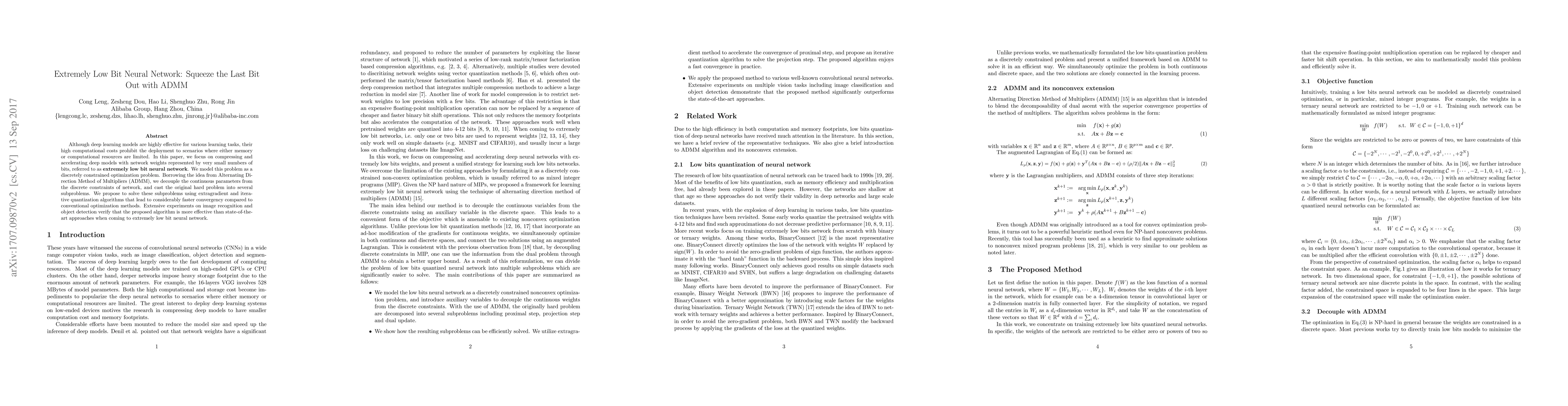This paper proposes an algorithm to compress and accelerate deep neural networks by representing weights in extremely low bit numbers, using ADMM to decouple continuous parameters from discrete constraints. The method employs extragradient and iterative quantization for faster convergence, outperforming state-of-the-art approaches in image recognition and object detection tasks.