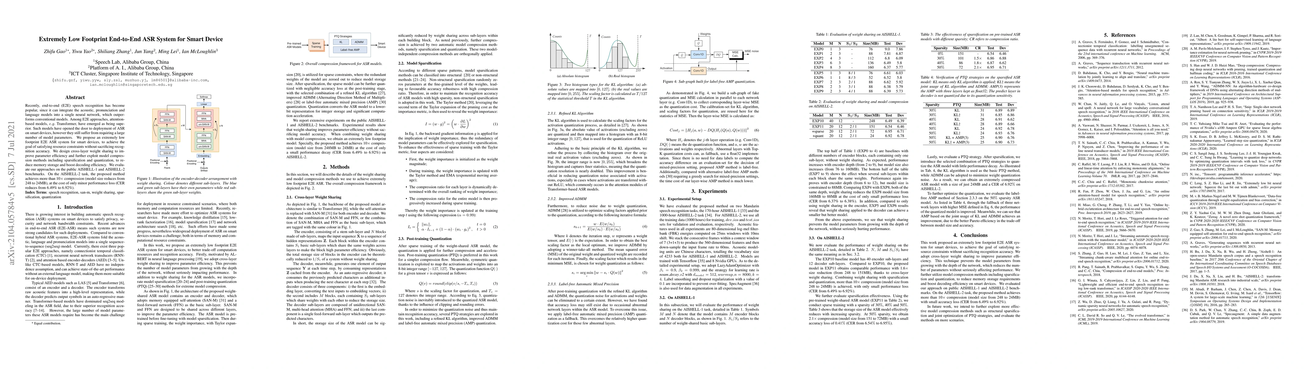This paper proposes an extremely low footprint end-to-end ASR system for smart devices, utilizing cross-layer weight sharing and model compression techniques to significantly reduce model size while maintaining recognition accuracy. Evaluations on AISHELL-1 and AISHELL-2 show over 10x compression with minimal performance loss.
