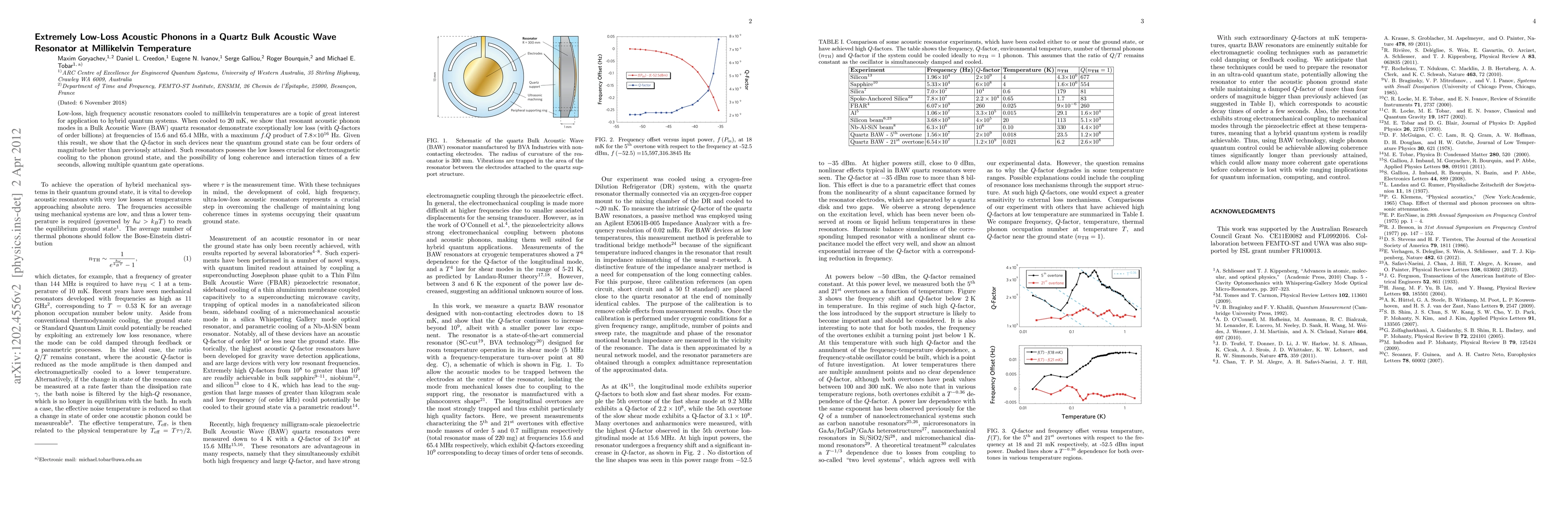 This paper demonstrates extremely low-loss acoustic phonon modes in a quartz Bulk Acoustic Wave resonator at 20 mK, achieving $Q$-factors of billions and a maximum $f.Q$ product of 7.8×10^16 Hz, significantly improving coherence times for quantum gate operations.
