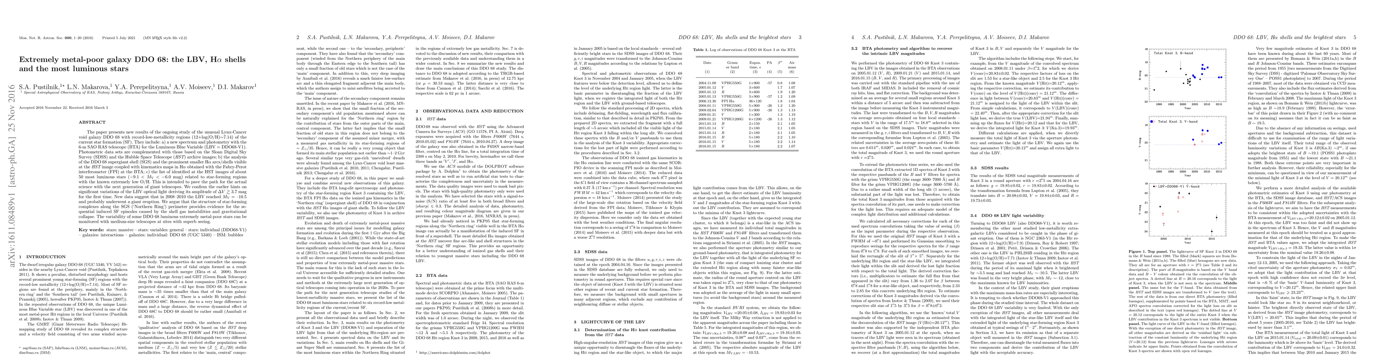This paper investigates the extremely metal-poor galaxy DDO 68, focusing on its Luminous Blue Variable (LBV), H-alpha shells, and the most luminous stars. It confirms significant variations in the LBV's luminosity, suggesting a possible giant eruption in 2008-2010, and argues that star-forming regions along the supergiant shell exhibit sequential induced star formation episodes.