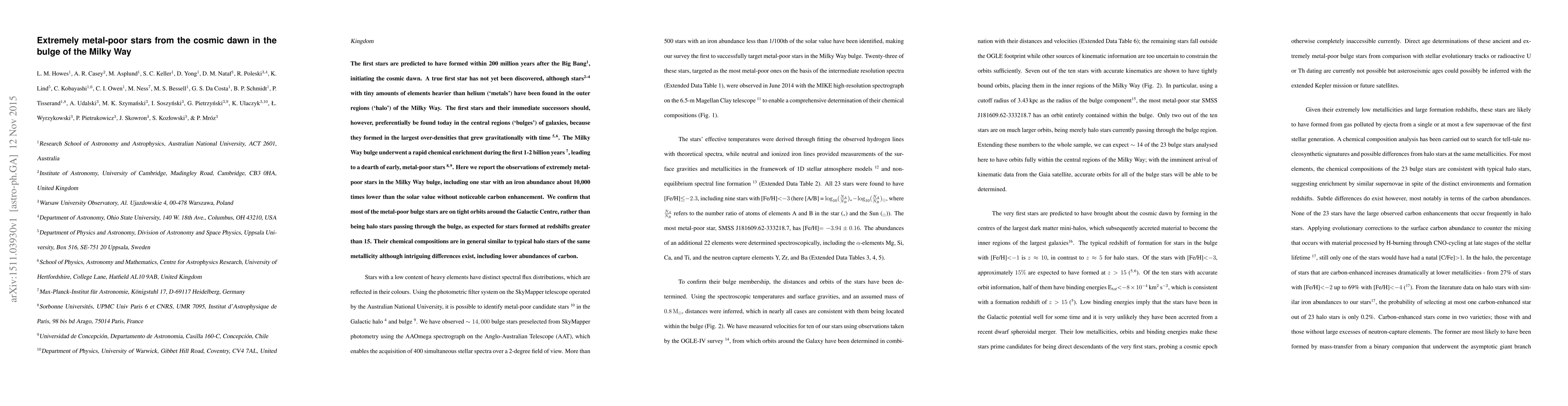 This paper reports the discovery of extremely metal-poor stars in the Milky Way bulge, including one star with an iron abundance 10,000 times lower than the solar value, suggesting these stars formed in the early universe. These stars are on tight orbits around the Galactic Centre, indicating they are not transient halo stars but likely formed in the cosmic dawn.