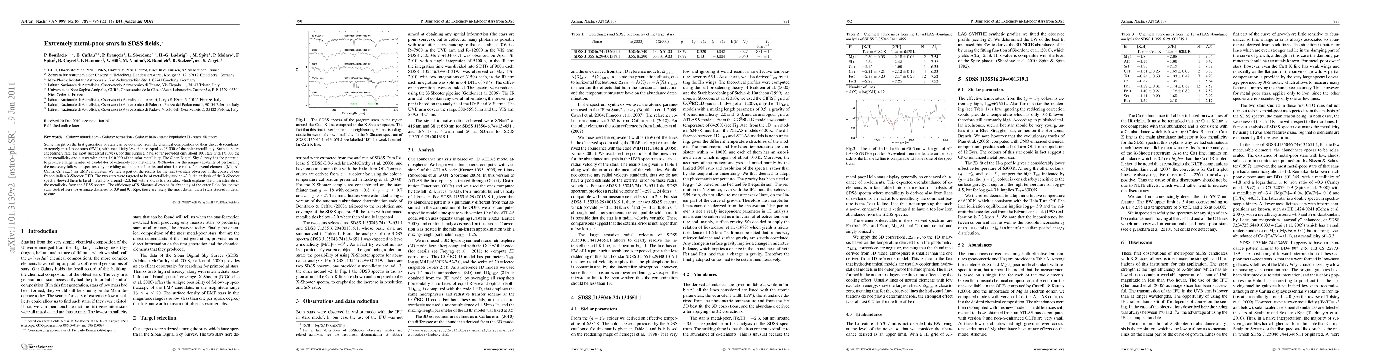 Some insight on the first generation of stars can be obtained from the chemical composition of their direct descendants, extremely metal-poor stars (EMP), with metallicity less than or equal to 1/1000 of the solar metalllicity. Such stars are exceedingly rare, the most successful surveys, for this purpose, have so far provided only about 100 stars with 1/1000 the solar metallicity and 4 stars with about 1/10000 of the solar metallicity. The Sloan Digital Sky Survey has the potential to provide a large number of candidates of extremely low metallicity. X-Shooter has the unique capability of performing the necessary follow-up spectroscopy providing accurate metallicities and abundance ratios for several elements (Mg, Al, Ca, Ti, Cr, Sr,...) for EMP candidates. We here report on the results for the first two stars observed in the course of our franco-italian X-Shooter GTO. The two stars were targeted to be of metallicity around -3.0, the analysis of the X-Shooter spectra showed them to be of metallicity around -2.0, but with a low alpha to iron ratio, which explains the underestimate of the metallicity from the SDSS spectra. The efficiency of X-Shooter allows an in situ study of the outer Halo, for the two stars studied here we estimate distances of 3.9 and 9.1 Kpc, these are likely the most distant dwarf stars studied in detail to date.