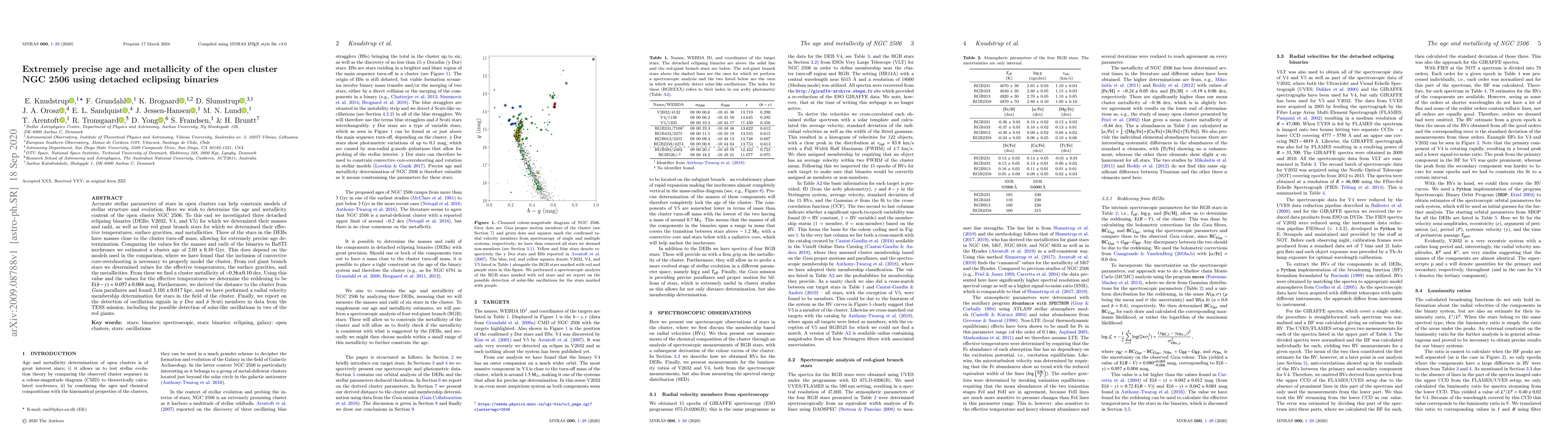 Accurate stellar parameters of stars in open clusters can help constrain models of stellar structure and evolution. Here we wish to determine the age and metallicity content of the open cluster NGC 2506. To this end we investigated three detached eclipsing binaries (DEBs; V2032, V4, and V5) for which we determined their masses and radii, as well as four red giant branch stars for which we determined their effective temperatures, surface gravities, and metallicities. Three of the stars in the DEBs have masses close to the cluster turn-off mass, allowing for extremely precise age determination. Comparing the values for the masses and radii of the binaries to BaSTI isochrones we estimated a cluster age of $2.01 \pm 0.10$ Gyr. This does depend on the models used in the comparison, where we have found that the inclusion of convective core-overshooting is necessary to properly model the cluster. From red giant branch stars we determined values for the effective temperatures, the surface gravities, and the metallicities. From these we find a cluster metallicity of $-0.36 \pm 0.10$ dex. Using this value and the values for the effective temperatures we determine the reddening to be E$(b - y) = 0.057 \pm 0.004$ mag. Furthermore, we derived the distance to the cluster from Gaia parallaxes and found $3.101 \pm 0.017$ kpc, and we have performed a radial velocity membership determination for stars in the field of the cluster. Finally, we report on the detection of oscillation signals in $\gamma$ Dor and $\delta$ Scuti members in data from the TESS mission, including the possible detection of solar-like oscillations in two of the red giants.