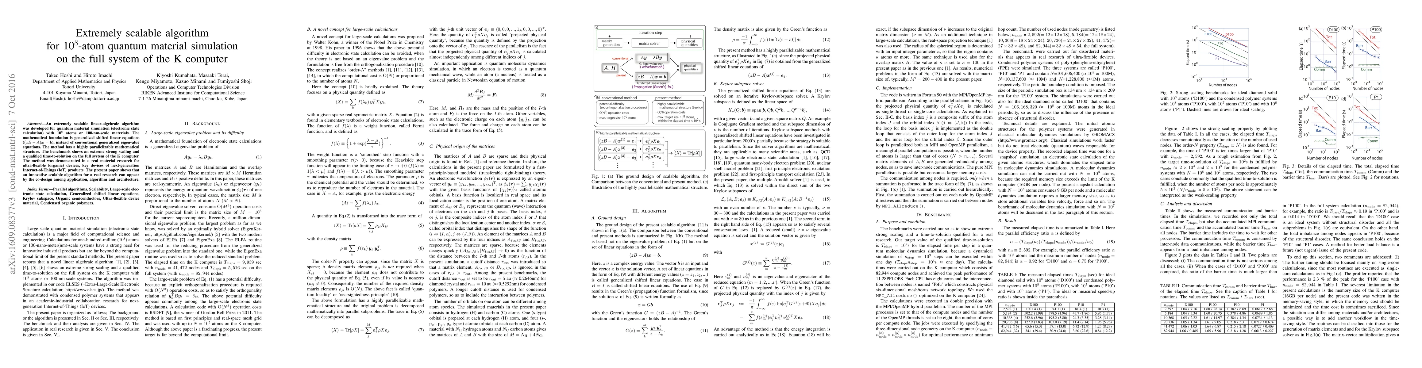 This paper presents an extremely scalable algorithm for simulating quantum materials with 10^8 atoms using the K computer, based on generalized shifted linear equations for electronic state calculations. The method demonstrates strong scaling and efficient time-to-solution, showcasing its potential for next-generation IoT devices.