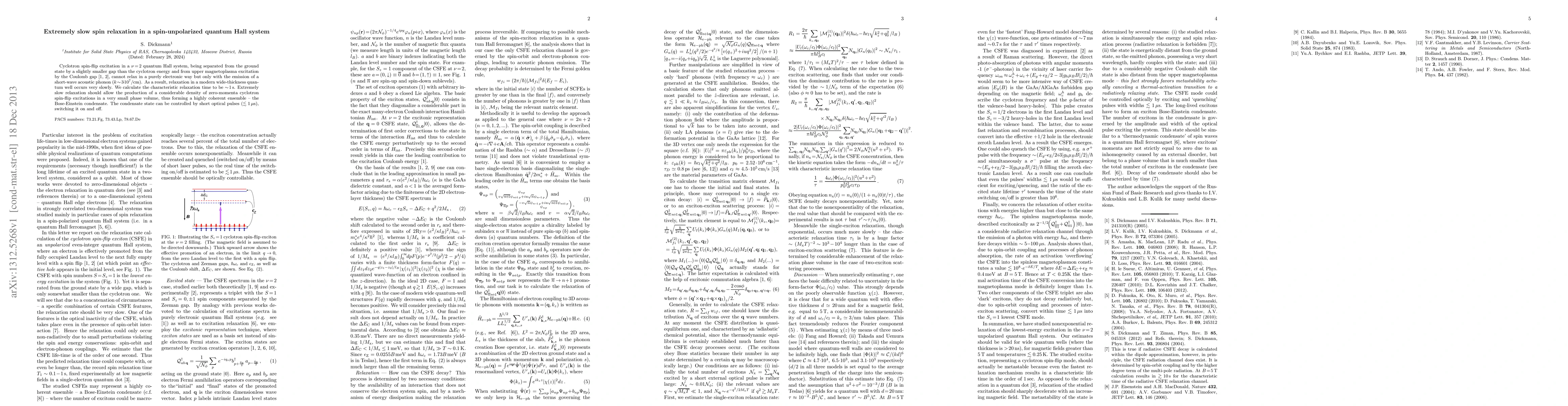 This research paper investigates extremely slow spin relaxation in a spin-unpolarized quantum Hall system at ν=2, revealing that cyclotron spin-flip excitations cannot relax electronically, leading to relaxation times on the order of 1 second. This slow relaxation enables the formation of a highly coherent Bose-Einstein condensate, controllable by short optical pulses.