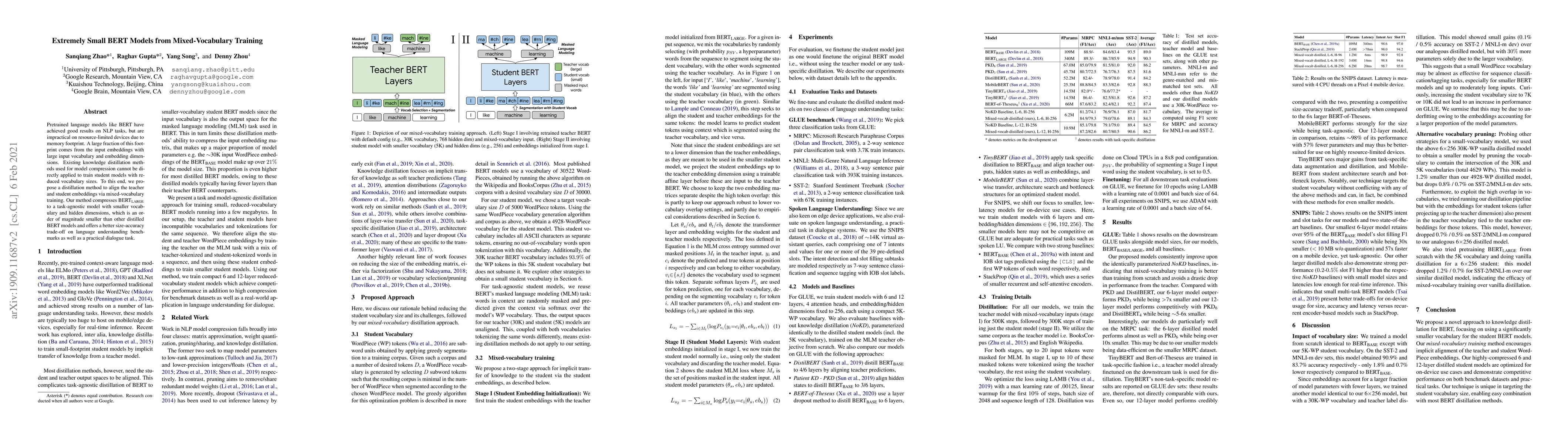 This paper proposes a novel distillation method to train smaller BERT models using mixed-vocabulary training, significantly reducing the memory footprint while maintaining performance. The method compresses BERT-LARGE to a more practical size, achieving a better size-accuracy trade-off on various NLP tasks.
