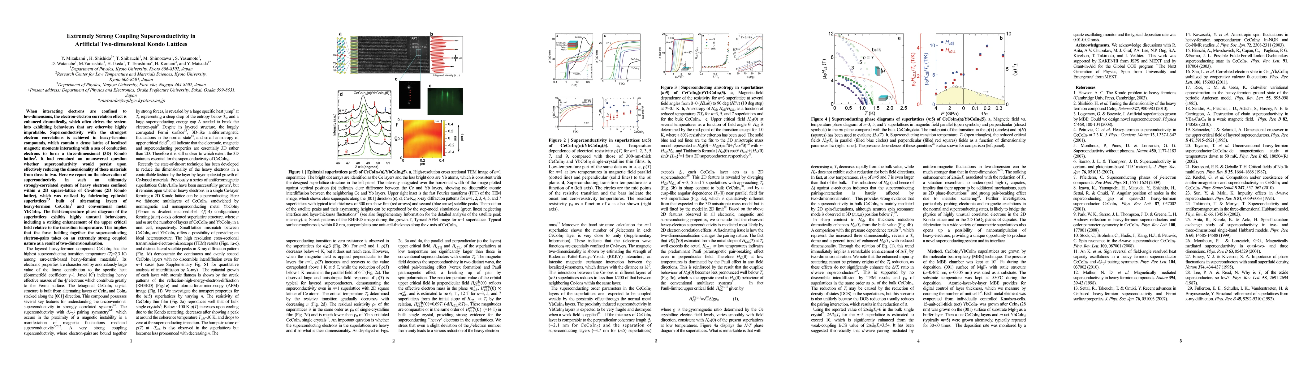 When interacting electrons are confined to low-dimensions, the electron-electron correlation effect is enhanced dramatically, which often drives the system into exhibiting behaviors that are otherwise highly improbable. Superconductivity with the strongest electron correlations is achieved in heavy-fermion compounds, which contain a dense lattice of localized magnetic moments interacting with a sea of conduction electrons to form a 3D Kondo lattice. It had remained an unanswered question whether superconductivity would persist upon effectively reducing the dimensionality of these materials from three to two. Here we report on the observation of superconductivity in such an ultimately strongly-correlated system of heavy electrons confined within a 2D square-lattice of Ce-atoms (2D Kondo lattice), which was realized by fabricating epitaxial superlattices built of alternating layers of heavy-fermion CeCoIn5 and conventional metal YbCoIn5. The field-temperature phase diagram of the superlattices exhibits highly unusual behaviors, including a striking enhancement of the upper critical field relative to the transition temperature. This implies that the force holding together the superconducting electron-pairs takes on an extremely strong coupled nature as a result of two-dimensionalization.