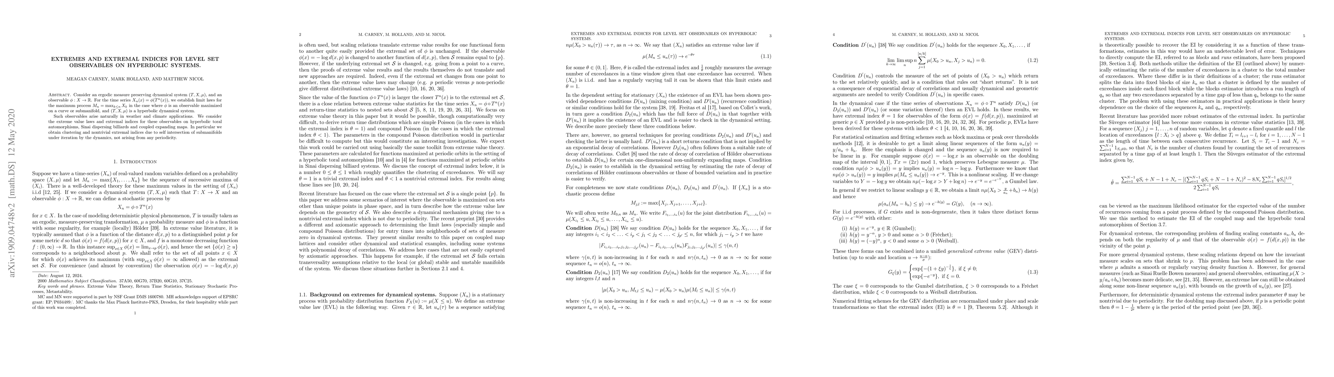 Researchers study extreme values of level set observables on hyperbolic systems, finding clustering and non-trivial extremal indices due to self-intersection under dynamics.