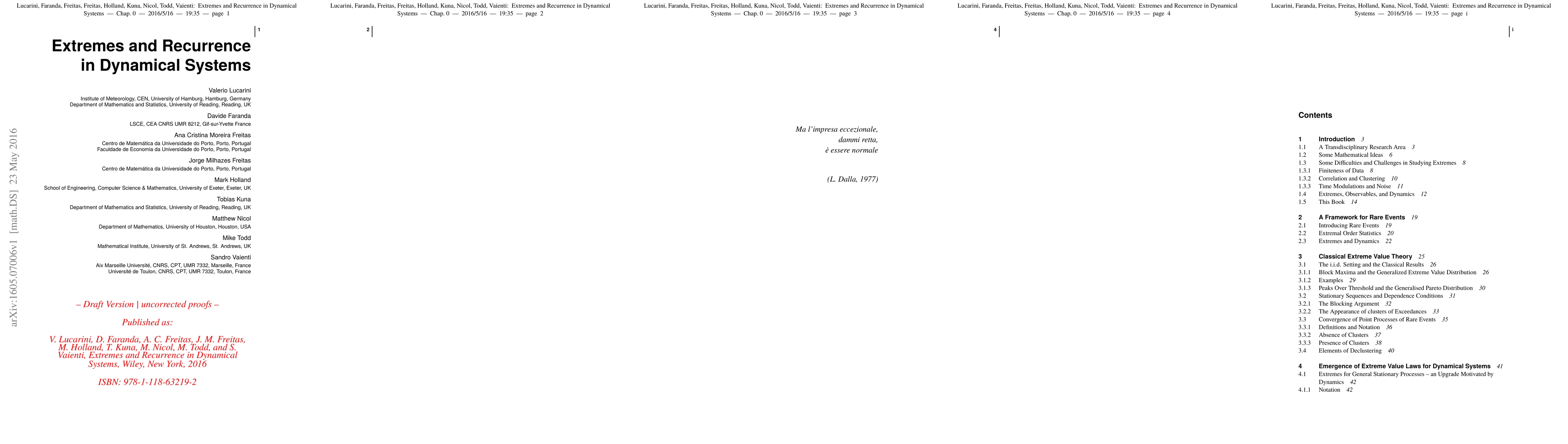 This book provides a comprehensive introduction for the study of extreme events in the context of dynamical systems. The introduction provides a broad overview of the interdisciplinary research area of extreme events, underlining its relevance for mathematics, natural sciences, engineering, and social sciences. After exploring the basics of the classical theory of extreme events, the book presents a careful examination of how a dynamical system can serve as a generator of stochastic processes, and explores in detail the relationship between the hitting and return time statistics of a dynamical system and the possibility of constructing extreme value laws for given observables. Explicit derivation of extreme value laws are then provided for selected dynamical systems. The book then discusses how extreme events can be used as probes for inferring fundamental dynamical and geometrical properties of a dynamical system and for providing a novel point of view in problems of physical and geophysical relevance. A final summary of the main results is then presented along with a discussion of open research questions. Finally, an appendix with software in Matlab programming language allows the readers to develop further understanding of the presented concepts.