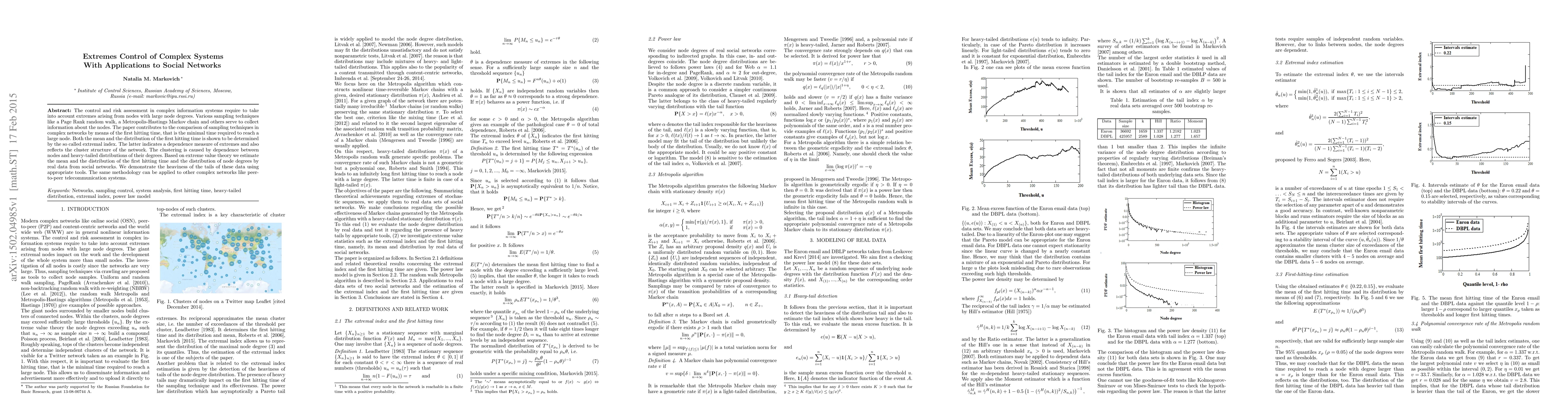 The control and risk assessment in complex information systems require to take into account extremes arising from nodes with large node degrees. Various sampling techniques like a Page Rank random walk, a Metropolis-Hastings Markov chain and others serve to collect information about the nodes. The paper contributes to the comparison of sampling techniques in complex networks by means of the first hitting time, that is the minimal time required to reach a large node. Both the mean and the distribution of the first hitting time is shown to be determined by the so called extremal index. The latter indicates a dependence measure of extremes and also reflects the cluster structure of the network. The clustering is caused by dependence between nodes and heavy-tailed distributions of their degrees. Based on extreme value theory we estimate the mean and the distribution of the first hitting time and the distribution of node degrees by real data from social networks. We demonstrate the heaviness of the tails of these data using appropriate tools. The same methodology can be applied to other complex networks like peer-to-peer telecommunication systems.