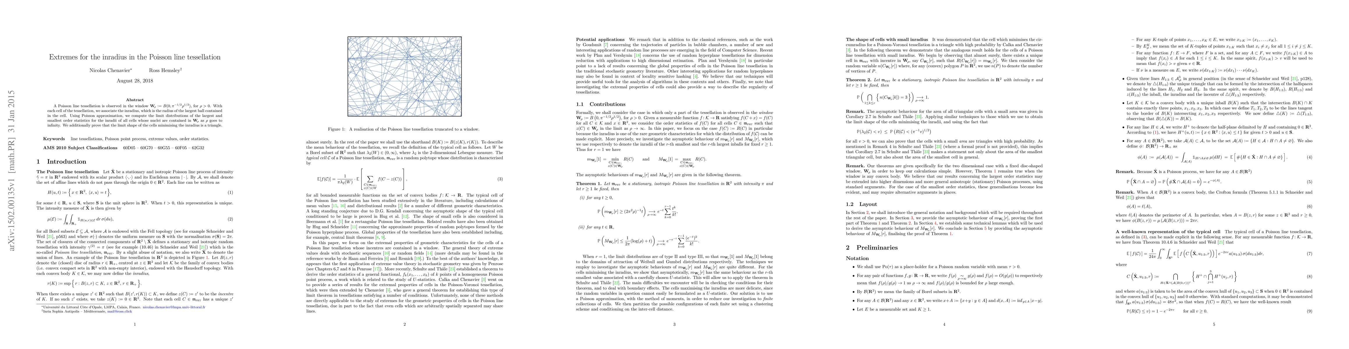 This paper studies the Poisson line tessellation and computes the limit distributions for the largest and smallest inradii of cells as the window size approaches infinity. It also proves that the optimal shape minimizing the inradius is a triangle.