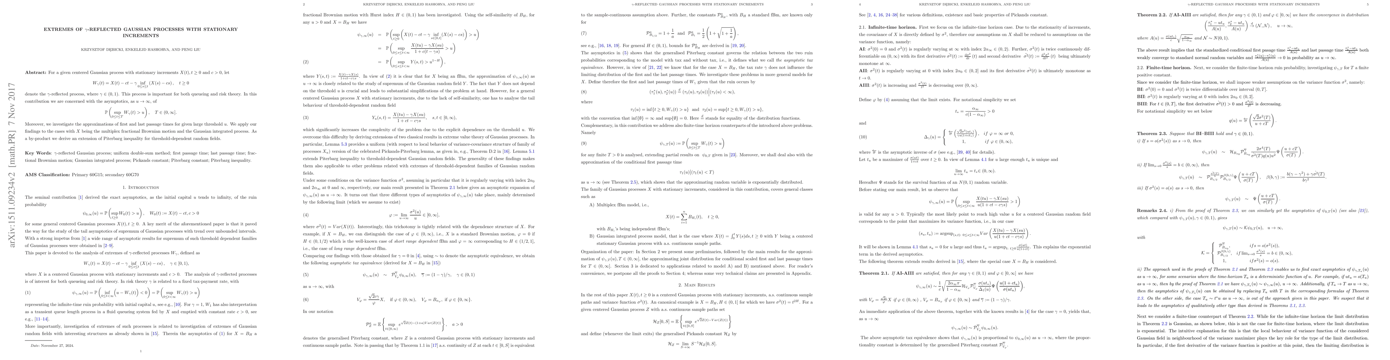 This paper studies the asymptotic behavior of a $\gamma$-reflected Gaussian process with stationary increments, modeling risk surplus processes with tax payments. It derives approximations for ruin probability and joint distribution of first and last passage times, applying these findings to multiplex fractional Brownian motion and integrated Gaussian processes, and extends the Piterbarg inequality for threshold-dependent random fields.