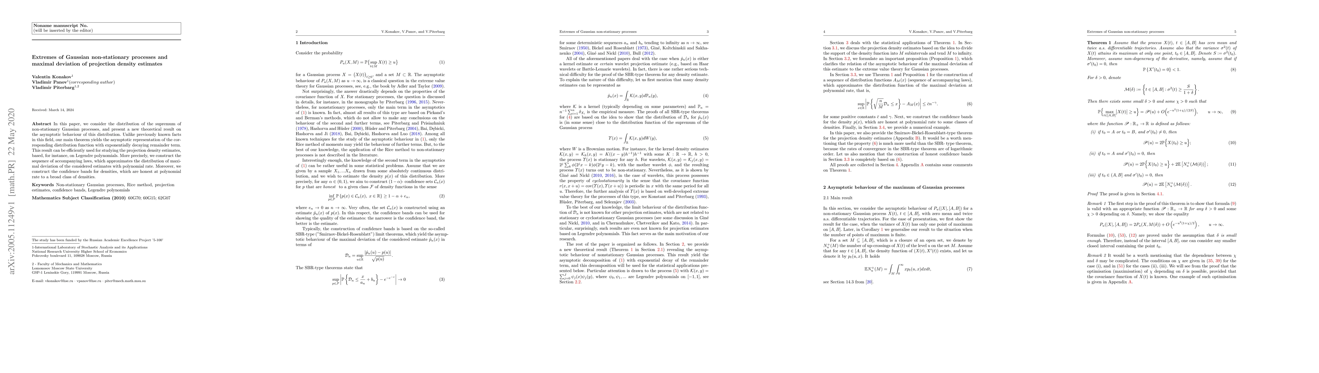 This paper explores the supremum distribution of non-stationary Gaussian processes, presenting a new asymptotic result with an exponentially decaying remainder. It also constructs confidence bands for projection density estimates with polynomial accuracy, applicable to a wide range of densities.