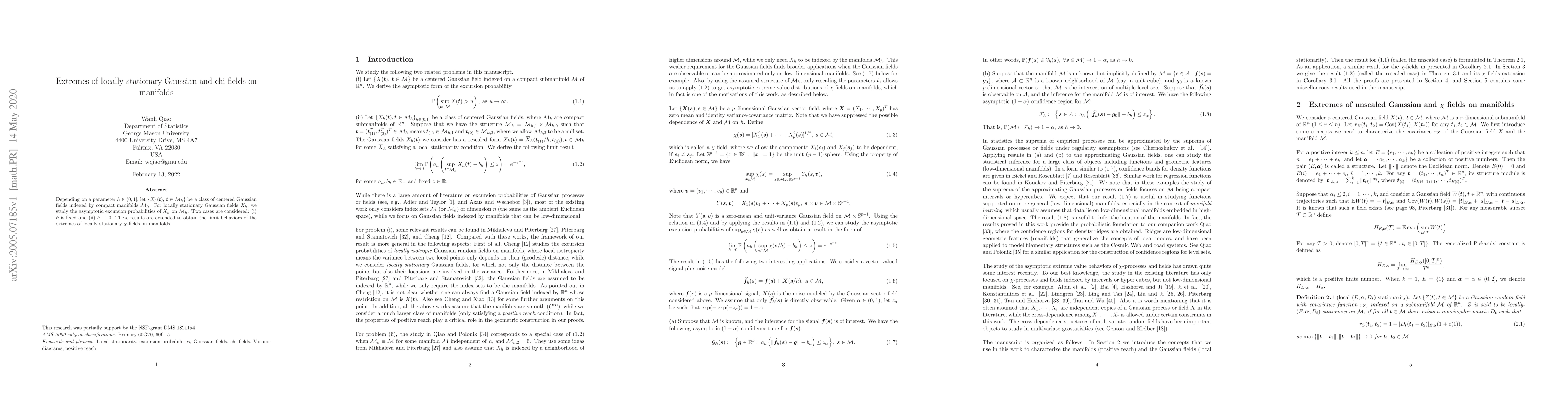 The paper introduces a method for analyzing the asymptotic excursion probabilities of locally stationary Gaussian and chi-square fields on manifolds, extending previous work on Gaussian fields.