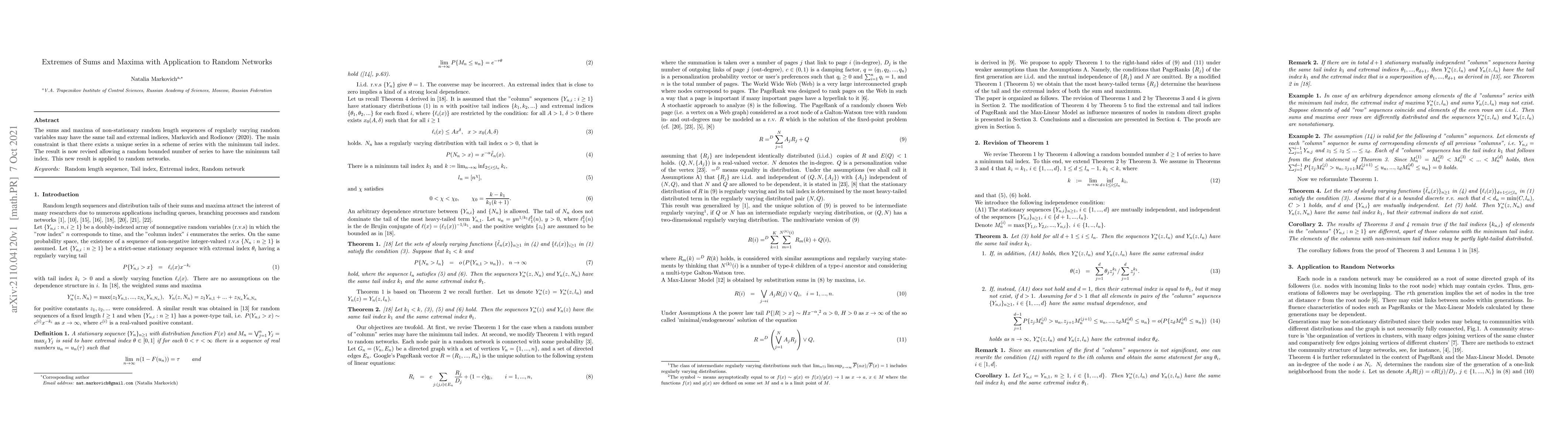 This paper explores the behavior of sums and maxima in non-stationary random sequences of regularly varying variables, showing that they can share tail and extremal indices. It revises previous results to allow for a random bounded number of series with the minimum tail index, and applies this to the analysis of random networks.