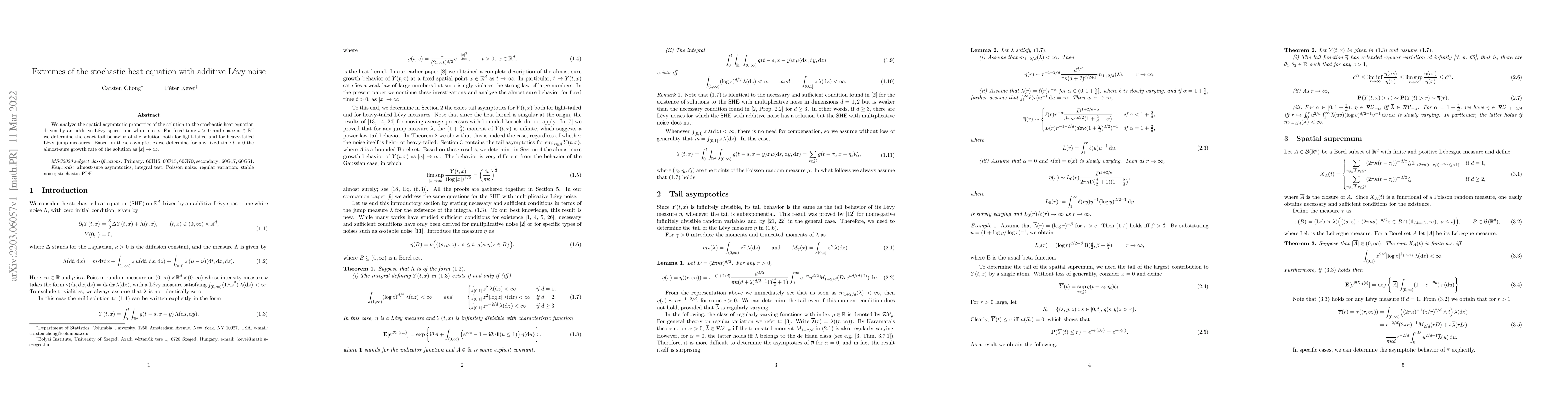 We analyze the spatial asymptotic properties of the solution to the stochastic heat equation driven by an additive L\'evy space-time white noise. For fixed time $t > 0$ and space $x \in \mathbb{R}^d$ we determine the exact tail behavior of the solution both for light-tailed and for heavy-tailed L\'evy jump measures. Based on these asymptotics we determine for any fixed time $t> 0$ the almost-sure growth rate of the solution as $|x| \to \infty$.