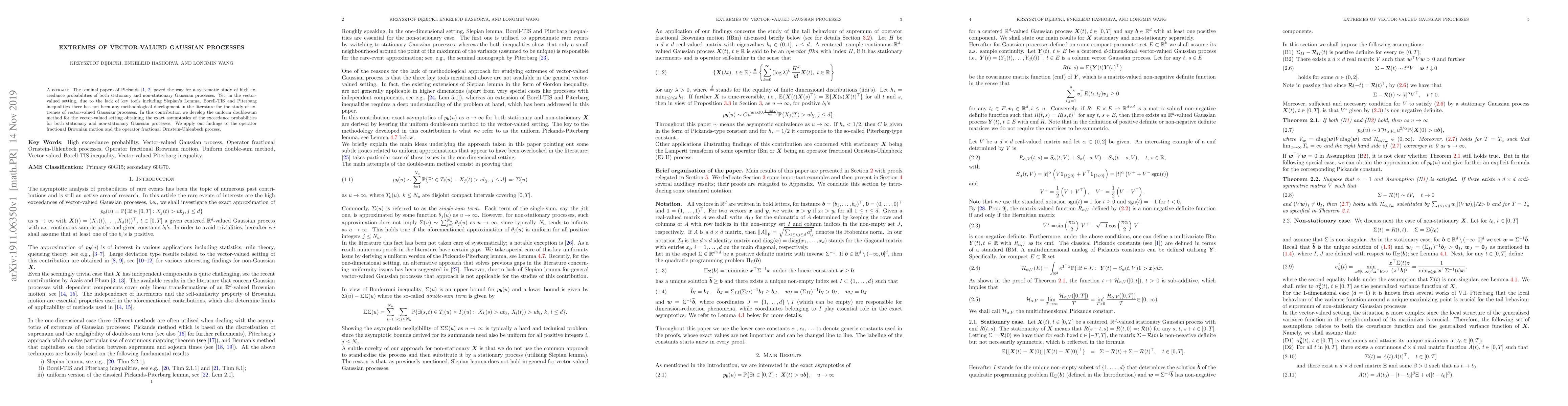 The seminal papers of Pickands [1,2] paved the way for a systematic study of high exceedance probabilities of both stationary and non-stationary Gaussian processes. Yet, in the vector-valued setting, due to the lack of key tools including Slepian's Lemma, Borell-TIS and Piterbarg inequalities there has not been any methodological development in the literature for the study of extremes of vector-valued Gaussian processes. In this contribution we develop the uniform double-sum method for the vector-valued setting obtaining the exact asymptotics of the exceedance probabilities for both stationary and non-stationary Gaussian processes. We apply our findings to the operator fractional Brownian motion and the operator fractional Ornstein-Uhlenbeck process.
