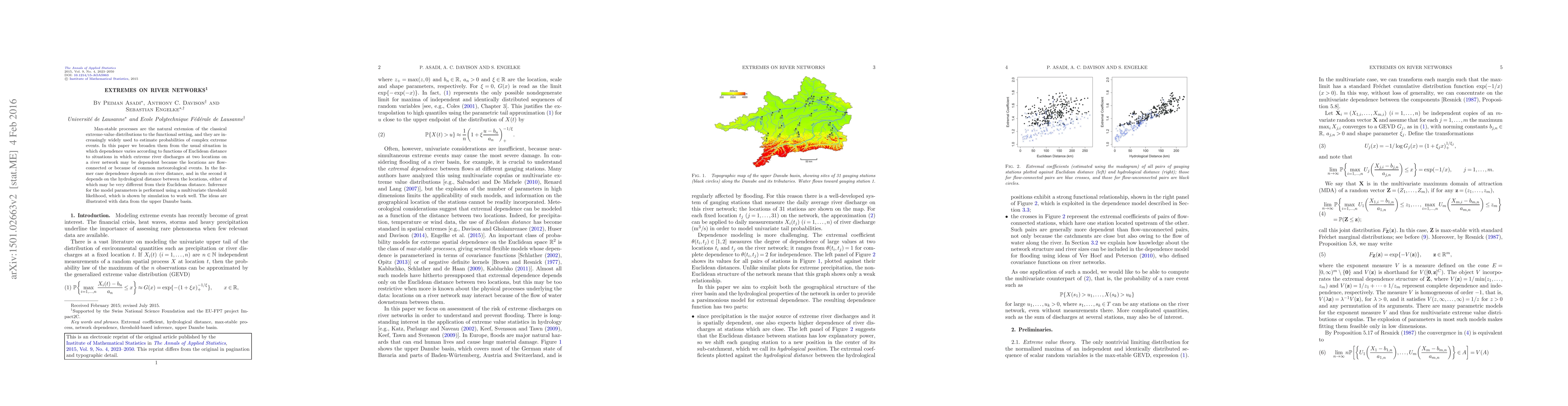This paper extends max-stable processes to river networks, accounting for dependence based on river and hydrological distances, rather than Euclidean distance. A multivariate threshold likelihood method is used for parameter inference, demonstrated effectively through simulations and applied to the upper Danube basin data.