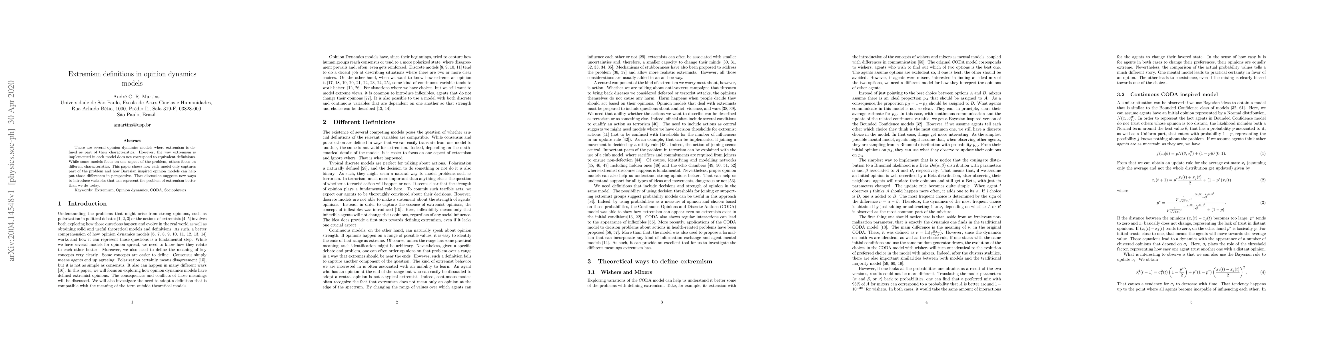 There are several opinion dynamics models where extremism is defined as part of their characteristics. However, the way extremism is implemented in each model does not correspond to equivalent definitions. While some models focus on one aspect of the problem, others focus on different characteristics. This paper shows how each model only captures part of the problem and how Bayesian inspired opinion models can help put those differences in perspective. That discussion suggests new ways to introduce variables that can represent the problem of extremism better than we do today. Keywords: Extremism, Opinion dynamics, CODA, Sociophysics