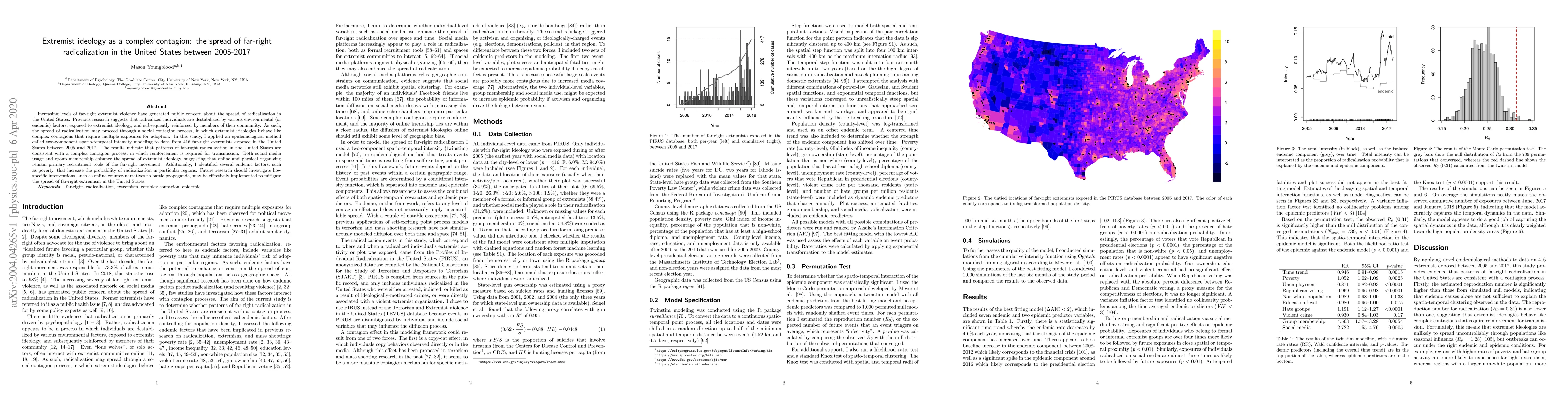 This study uses epidemiological modeling to analyze the spread of far-right radicalization in the U.S. from 2005-2017, finding it follows a complex contagion process requiring multiple exposures and reinforcement. Social media and group membership significantly enhance the spread, while endemic factors like poverty increase radicalization risk in certain regions.