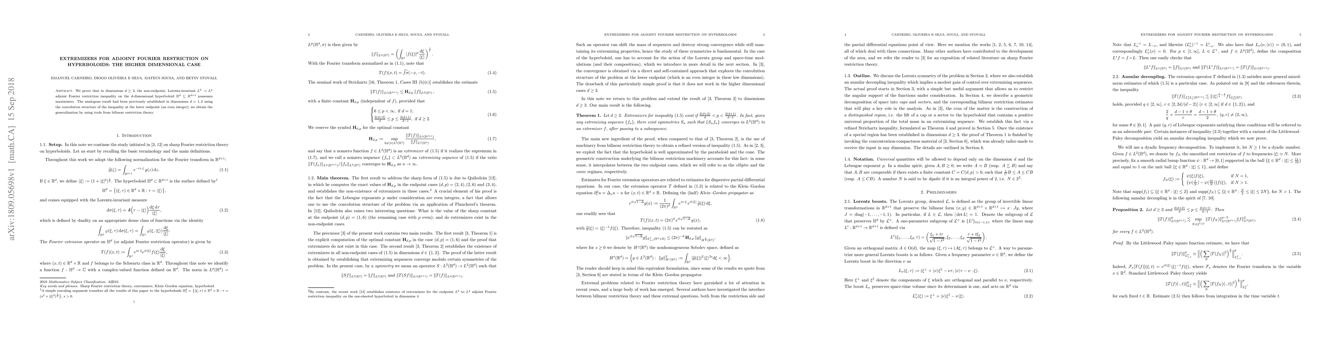 We prove that in dimensions $d \geq 3$, the non-endpoint, Lorentz-invariant $L^2 \to L^p$ adjoint Fourier restriction inequality on the $d$-dimensional hyperboloid $\mathbb{H}^d \subseteq \mathbb{R}^{d+1}$ possesses maximizers. The analogous result had been previously established in dimensions $d=1,2$ using the convolution structure of the inequality at the lower endpoint (an even integer); we obtain the generalization by using tools from bilinear restriction theory.