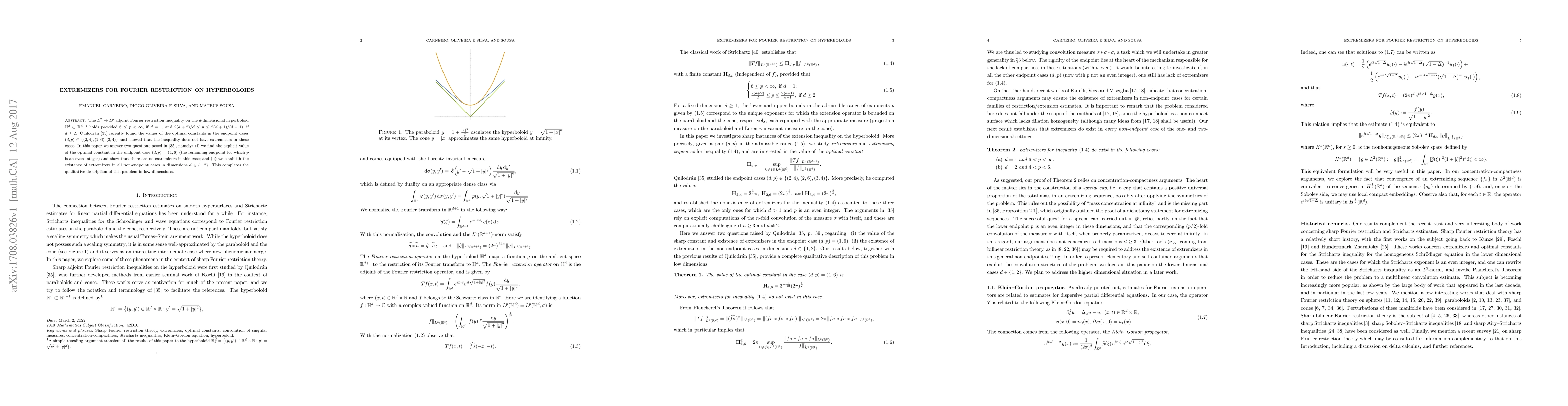 The $L^2 \to L^p$ adjoint Fourier restriction inequality on the $d$-dimensional hyperboloid $\mathbb{H}^d \subset \mathbb{R}^{d+1}$ holds provided $6 \leq p < \infty$, if $d=1$, and $2(d+2)/d \leq p\leq 2(d+1)/(d-1)$, if $d\geq2$. Quilodr\'{a}n recently found the values of the optimal constants in the endpoint cases $(d,p)\in\{(2,4),(2,6),(3,4)\}$ and showed that the inequality does not have extremizers in these cases. In this paper we answer two questions posed by Quilodr\'{a}n, namely: (i) we find the explicit value of the optimal constant in the endpoint case $(d,p) = (1,6)$ (the remaining endpoint for which $p$ is an even integer) and show that there are no extremizers in this case; and (ii) we establish the existence of extremizers in all non-endpoint cases in dimensions $d \in \{1,2\}$. This completes the qualitative description of this problem in low dimensions.