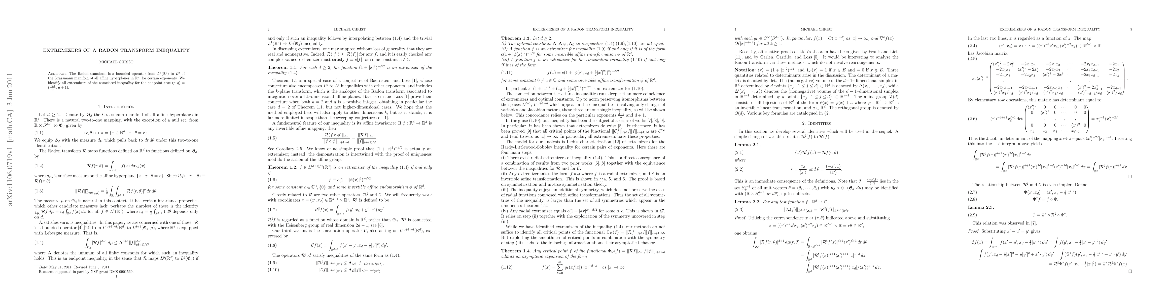 The Radon transform is a bounded operator from L^p of Euclidean space R^d to L^q of the Grassmann manifold of all affine hyperplanes in R^d, for certain exponents. We identify all extremizers of the associated inequality for the endpoint case p=(d+1)/d and q=d+1.