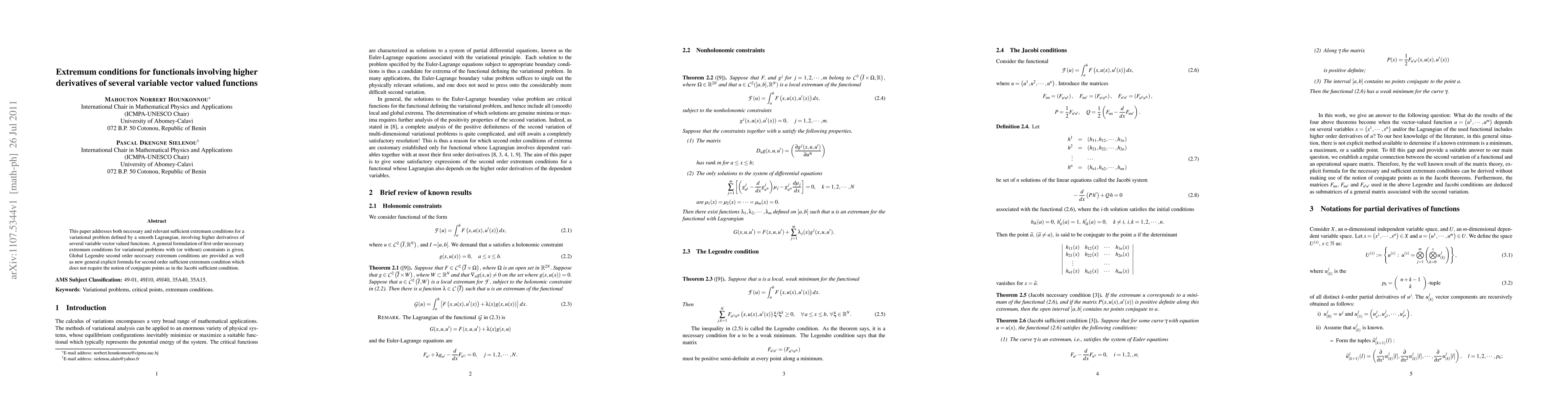 This paper addresses both necessary and relevant sufficient extremum conditions for a variational problem defined by a smooth Lagrangian, involving higher derivatives of several variable vector valued functions. A general formulation of first order necessary extremum conditions for variational problems with (or without) constraints is given. Global Legendre second order necessary extremum conditions are provided as well as new general explicit formula for second order sufficient extremum condition which does not require the notion of conjugate points as in the Jacobi sufficient condition.
