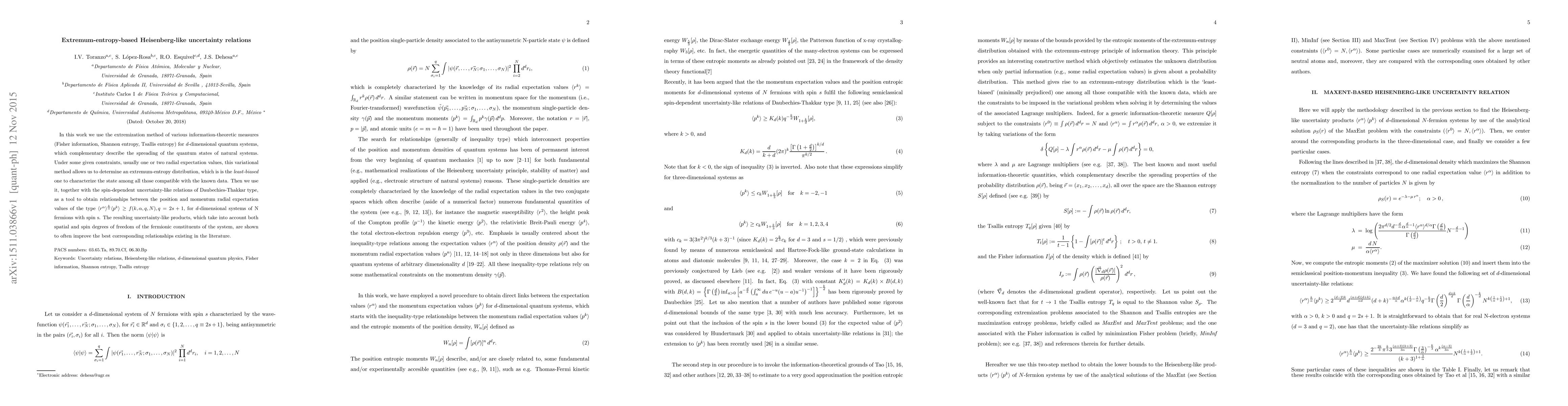 This paper develops extremum-entropy distributions using variational methods for $d$-dimensional quantum systems, employing Fisher, Shannon, and Tsallis entropies. It utilizes these distributions to derive improved Heisenberg-like uncertainty relations for the position and momentum of fermions, considering both spatial and spin degrees of freedom.