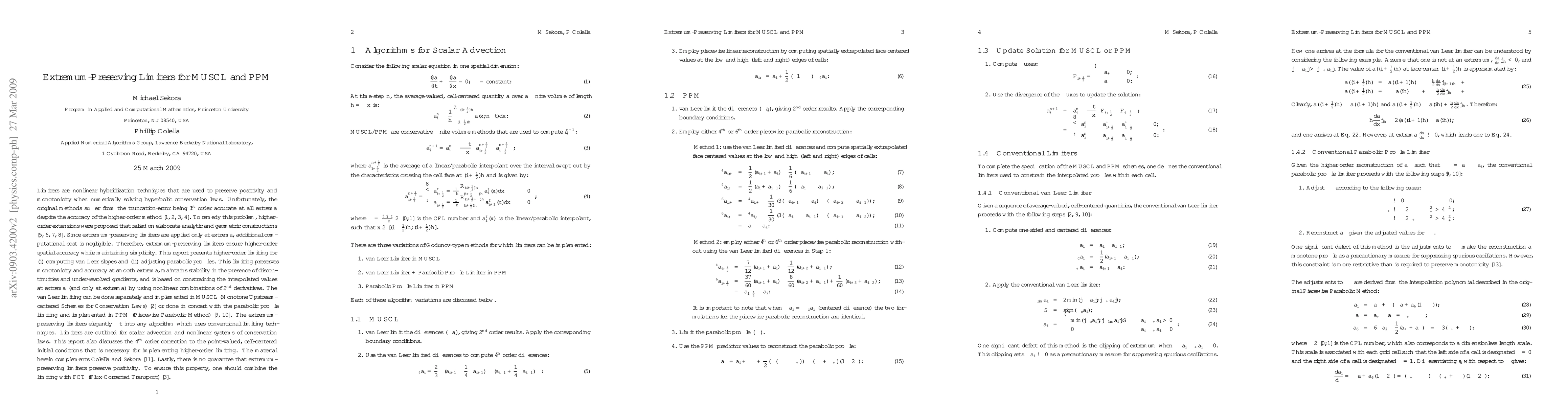 Limiters are nonlinear hybridization techniques that are used to preserve positivity and monotonicity when numerically solving hyperbolic conservation laws. Unfortunately, the original methods suffer from the truncation-error being first-order accurate at all extrema despite the accuracy of the higher-order method. To remedy this problem, higher-order extensions were proposed that relied on elaborate analytic and geometric constructions. Since extremum-preserving limiters are applied only at extrema, additional computational cost is negligible. Therefore, extremum-preserving limiters ensure higher-order spatial accuracy while maintaining simplicity. This report presents higher-order limiting for (i) computing van Leer slopes and (ii) adjusting parabolic profiles. This limiting preserves monotonicity and accuracy at smooth extrema, maintains stability in the presence of discontinuities and under-resolved gradients, and is based on constraining the interpolated values at extrema (and only at extrema) by using nonlinear combinations of second derivatives. The van Leer limiting can be done separately and implemented in MUSCL (Monotone Upstream-centered Schemes for Conservation Laws) or done in concert with the parabolic profile limiting and implemented in PPM (Piecewise Parabolic Method). The extremum-preserving limiters elegantly fit into any algorithm which uses conventional limiting techniques. Limiters are outlined for scalar advection and nonlinear systems of conservation laws. This report also discusses the fourth-order correction to the point-valued, cell-centered initial conditions that is necessary for implementing higher-order limiting.