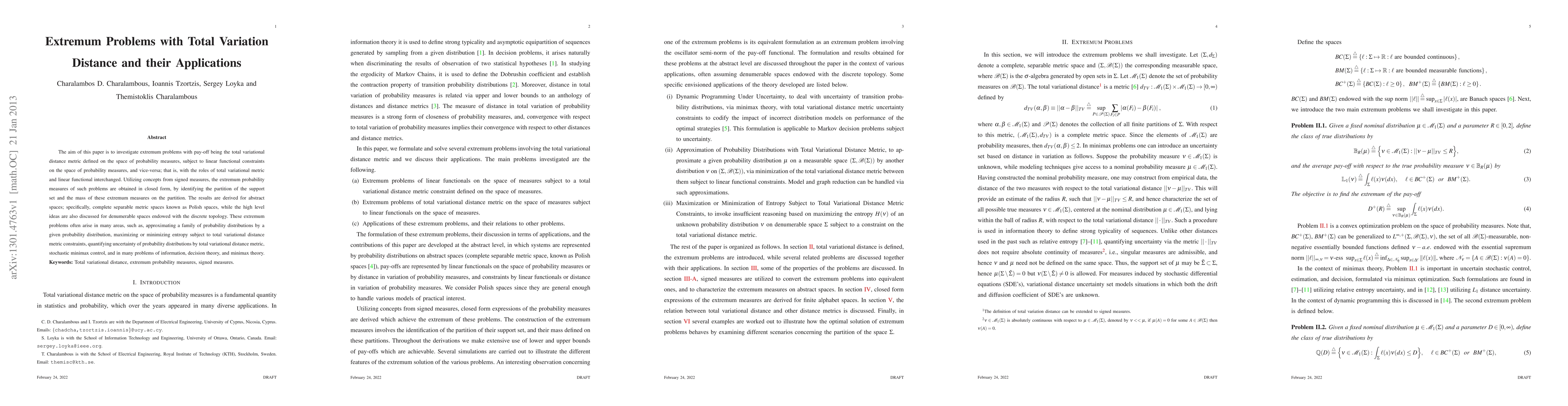 This paper explores extremum problems where the total variation distance metric is used as the pay-off, subject to linear functional constraints, and vice versa. It derives closed-form solutions for extremum probability measures using signed measures and discusses applications in information theory, decision theory, and stochastic control.