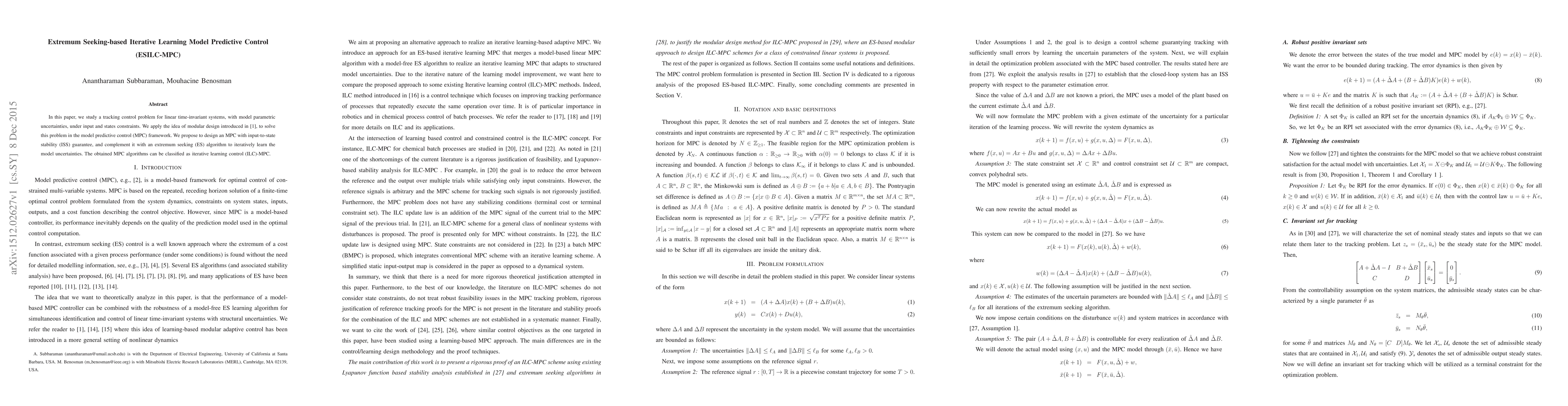 This paper proposes an Extremum Seeking-based Iterative Learning Model Predictive Control (ESILC-MPC) for tracking control in linear time-invariant systems with parametric uncertainties, utilizing input-to-state stability and an iterative learning algorithm to improve performance under constraints. The method combines model predictive control with extremum seeking to refine the model over time.