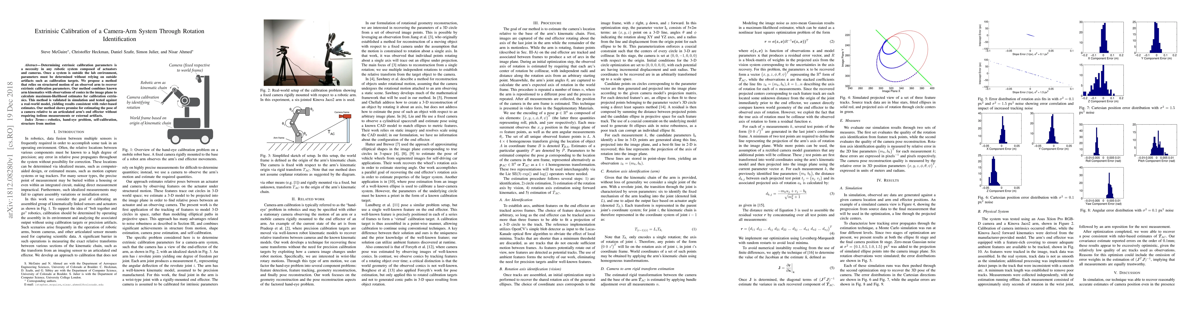 This paper proposes a method for extrinsic calibration of a camera-arm system using the arm's structured motion, combining arm kinematics and image plane conics for maximum-likelihood estimates. The approach is validated in simulation and real-world tests, showing consistent results with traditional ruler-based methods.