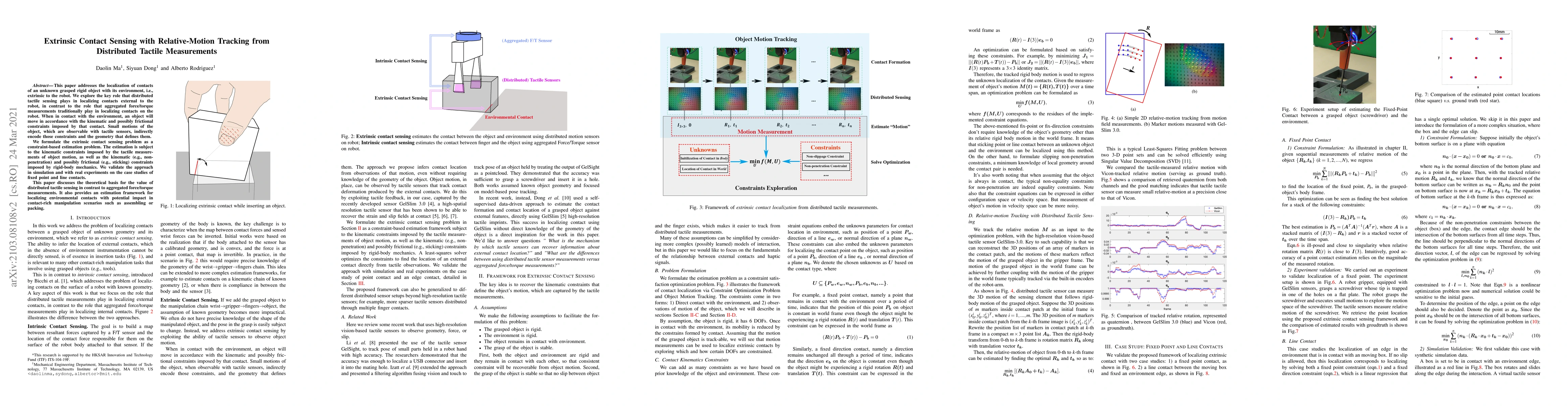 This paper addresses the localization of contacts of an unknown grasped rigid object with its environment, i.e., extrinsic to the robot. We explore the key role that distributed tactile sensing plays in localizing contacts external to the robot, in contrast to the role that aggregated force/torque measurements play in localizing contacts on the robot. When in contact with the environment, an object will move in accordance with the kinematic and possibly frictional constraints imposed by that contact. Small motions of the object, which are observable with tactile sensors, indirectly encode those constraints and the geometry that defines them. We formulate the extrinsic contact sensing problem as a constraint-based estimation. The estimation is subject to the kinematic constraints imposed by the tactile measurements of object motion, as well as the kinematic (e.g., non-penetration) and possibly frictional (e.g., sticking) constraints imposed by rigid-body mechanics. We validate the approach in simulation and with real experiments on the case studies of fixed point and line contacts. This paper discusses the theoretical basis for the value of distributed tactile sensing in contrast to aggregated force/torque measurements. It also provides an estimation framework for localizing environmental contacts with potential impact in contact-rich manipulation scenarios such as assembling or packing.
