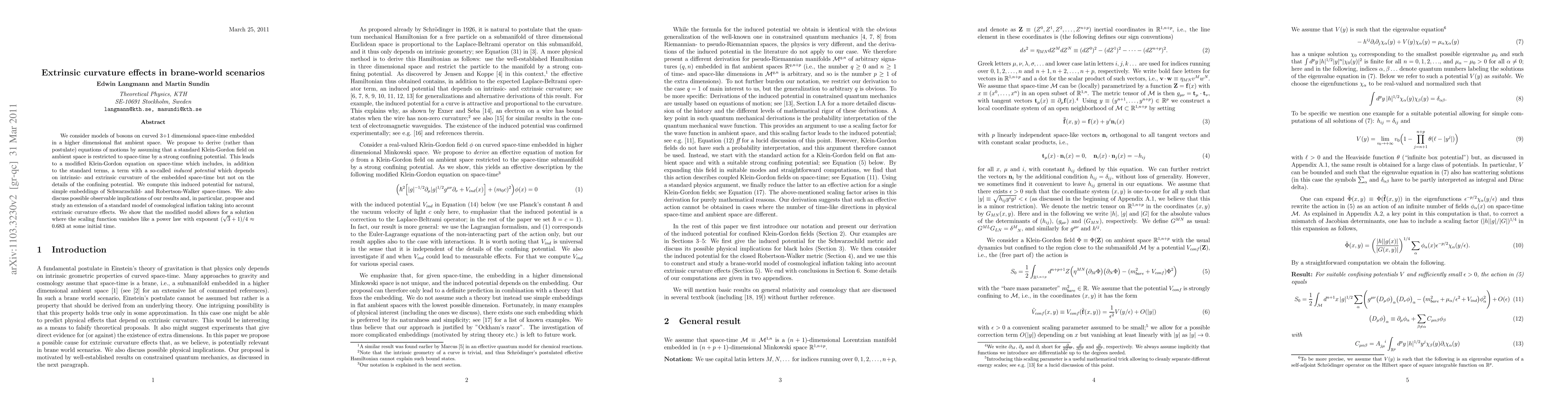 We consider models of bosons on curved 3+1 dimensional space-time embedded in a higher dimensional flat ambient space. We propose to derive (rather than postulate) equations of motions by assuming that a standard Klein-Gordon field on ambient space is restricted to space-time by a strong confining potential. This leads to a modified Klein-Gordon equation on space-time which includes, in addition to the standard terms, a term with a so-called induced potential which depends on intrinsic- and extrinsic curvature of the embedded space-time but not on the details of the confining potential. We compute this induced potential for natural, simple embeddings of Schwarzschild- and Robertson-Walker space-times. We also discuss possible observable implications of our results and, in particular, propose and study an extension of a standard model of cosmological inflation taking into account extrinsic curvature effects. We show that the modified model allows for a solution where the scaling function vanishes like a power law with exponent 0.6830.. at some initial time.