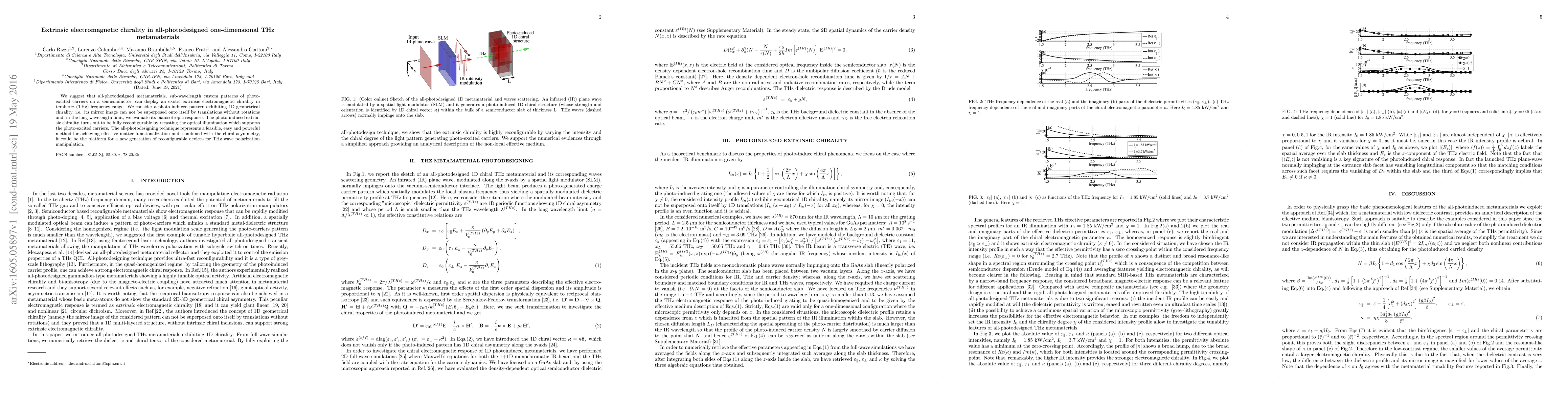 We suggest that all-photodesigned metamaterials, sub-wavelength custom patterns of photo-excited carriers on a semiconductor, can display an exotic extrinsic electromagnetic chirality in terahertz (THz) frequency range. We consider a photo-induced pattern exhibiting 1D geometrical chirality, i.e. its mirror image can not be superposed onto itself by translations without rotations and, in the long wavelength limit, we evaluate its bianisotropic response. The photo-induced extrinsic chirality turns out to be fully reconfigurable by recasting the optical illumination which supports the photo-excited carriers. The all-photodesigning technique represents a feasible, easy and powerful method for achieving effective matter functionalization and, combined with the chiral asymmetry, it could be the platform for a new generation of reconfigurable devices for THz wave polarization manipulation.