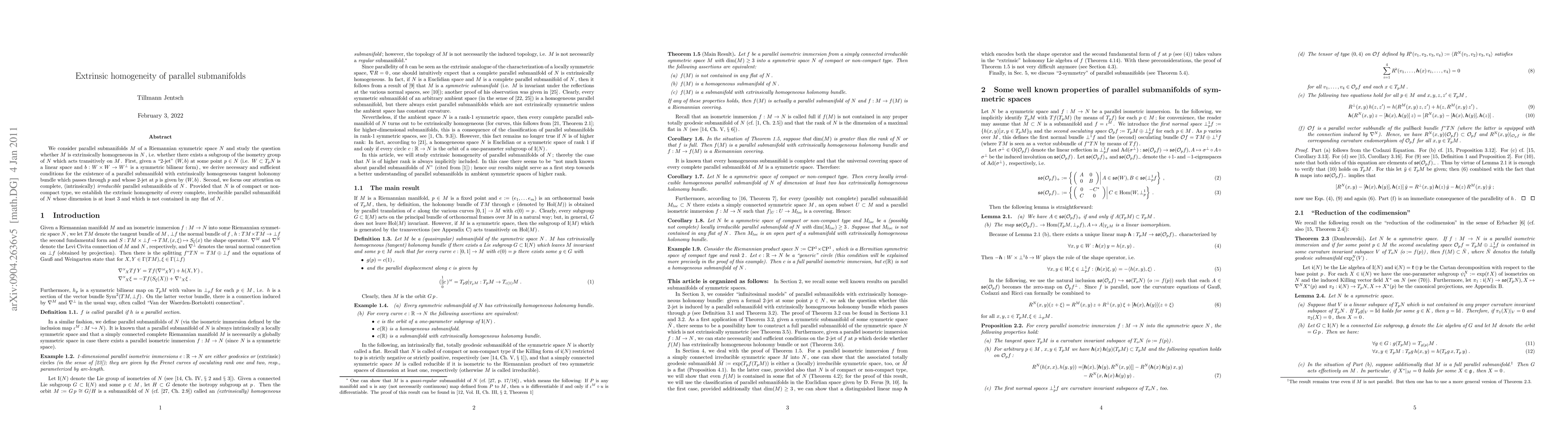 This research paper investigates the extrinsic homogeneity of parallel submanifolds within Riemannian symmetric spaces, deriving conditions for the existence of such submanifolds with homogeneous tangent holonomy. It concludes that complete, irreducible parallel submanifolds of certain dimensions and types exhibit extrinsic homogeneity.