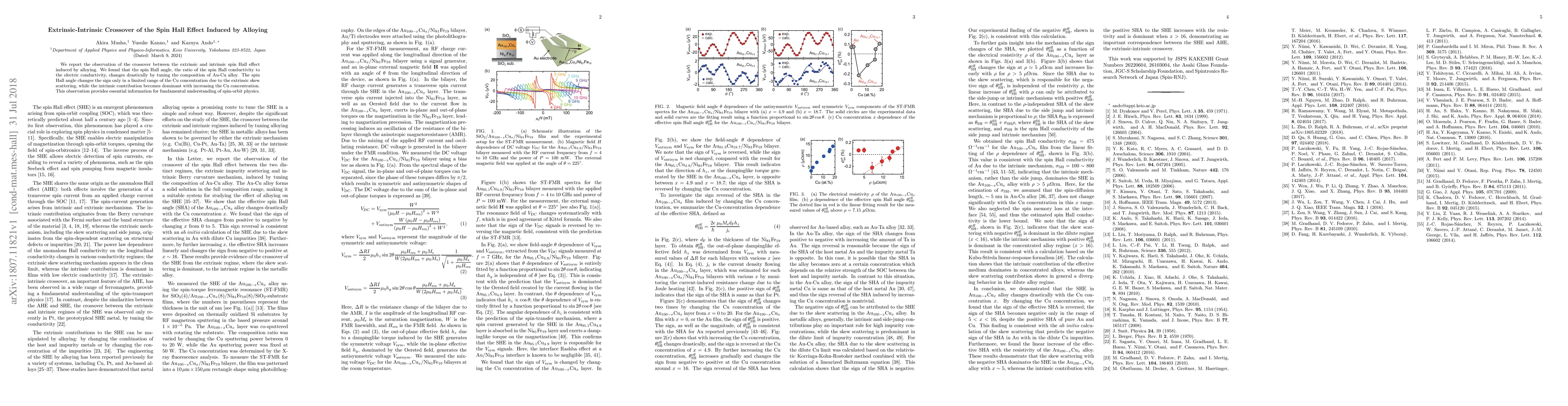 Summary: This paper observes a crossover between extrinsic and intrinsic spin Hall effects in Au-Cu alloys, showing that the spin Hall angle drastically changes with alloy composition. The study reveals the transition from extrinsic skew scattering to intrinsic contributions, providing insights into spin-orbit physics.