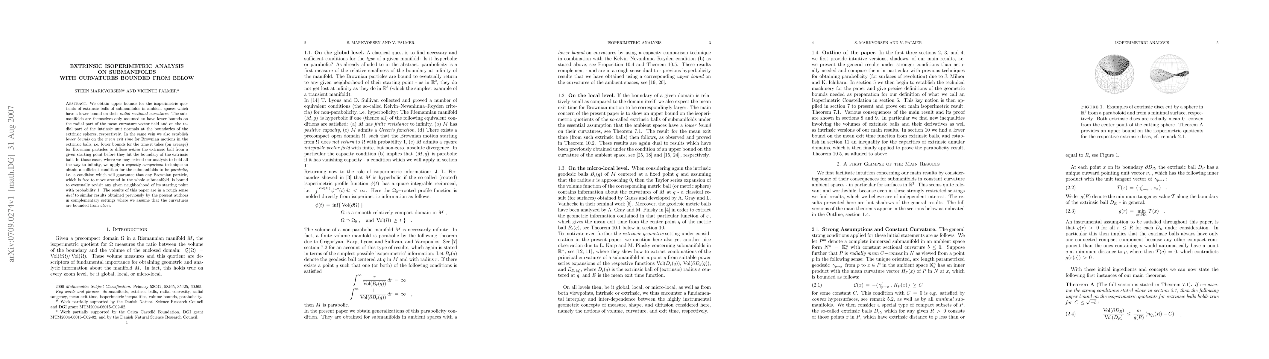 We obtain upper bounds for the isoperimetric quotients of extrinsic balls of submanifolds in ambient spaces which have a lower bound on their radial sectional curvatures. The submanifolds are themselves only assumed to have lower bounds on the radial part of the mean curvature vector field and on the radial part of the intrinsic unit normals at the boundaries of the extrinsic spheres, respectively. In the same vein we also establish lower bounds on the mean exit time for Brownian motion in the extrinsic balls. In those cases, where we may extend our analysis to hold all the way to infinity, we apply a capacity comparison technique to obtain a sufficient condition for the submanifolds to be parabolic, i.e. a condition which will guarantee that any Brownian particle, which is free to move around in the whole submanifold, is bound to eventually revisit any given neighborhood of its starting point with probability 1. The results of this paper are in a rough sense dual to similar results obtained previously by the present authors in complementary settings where we assume that the curvatures are bounded from above.