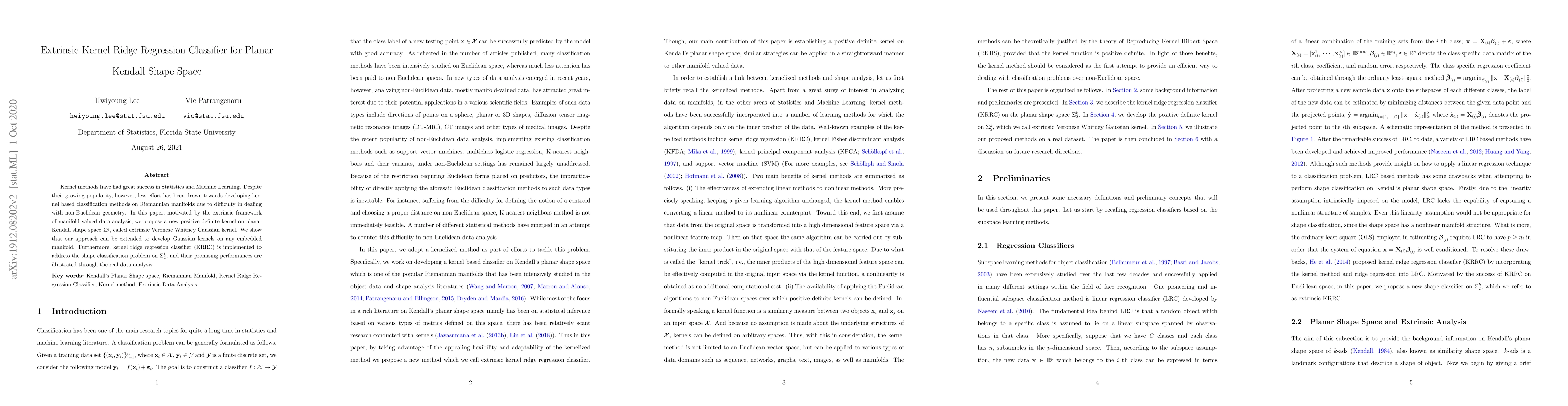 This paper proposes an extrinsic kernel ridge regression classifier for planar Kendall shape space, introducing a new positive definite kernel called the extrinsic Veronese Whitney Gaussian kernel. The method is shown to extend to any embedded manifold and demonstrates promising performance in shape classification tasks.