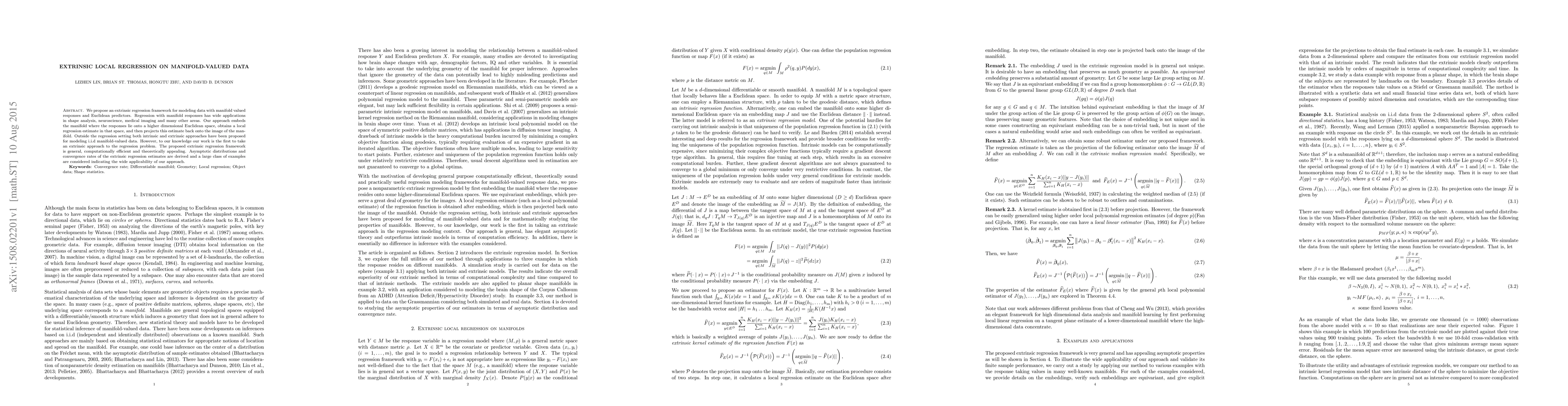 This paper introduces an extrinsic regression framework for modeling data where responses lie on a manifold and predictors are Euclidean. The method embeds the manifold into a higher-dimensional space, performs local regression, and projects the results back onto the manifold, offering computational efficiency and theoretical appeal.