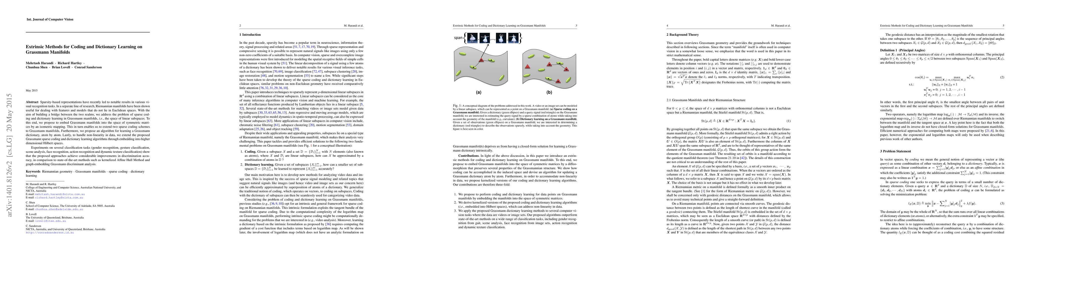 This paper proposes methods for sparse coding and dictionary learning on Grassmann manifolds, embedding them into symmetric matrices for easier manipulation. The authors achieve closed-form solutions for learning a Grassmann dictionary and extend their algorithms to handle non-linear data through Hilbert space embeddings, demonstrating significant improvements in various classification tasks.