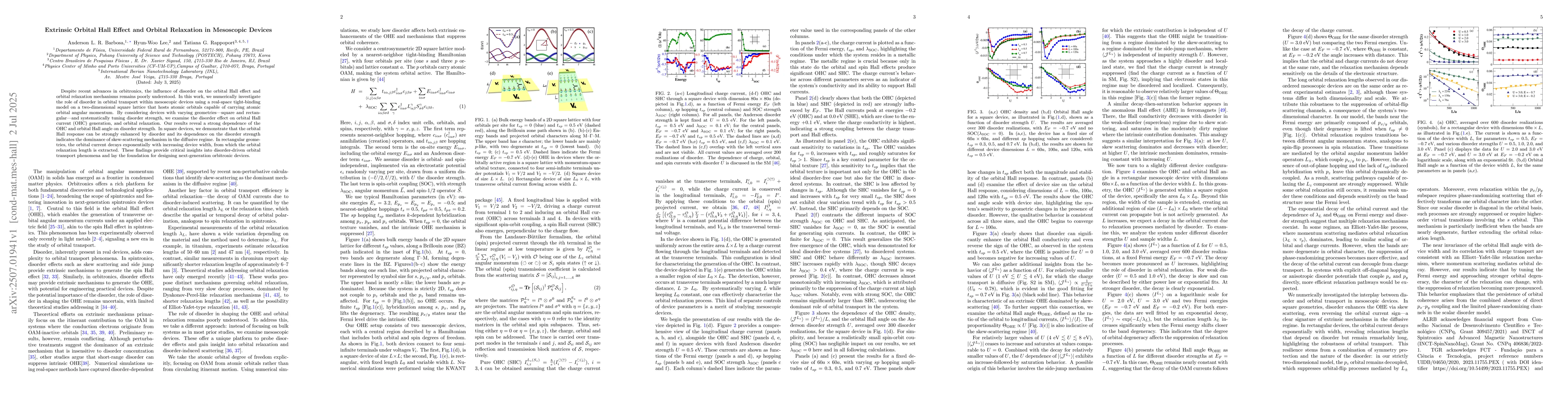 Despite recent advances in orbitronics, the influence of disorder on the orbital Hall effect and orbital relaxation mechanisms remains poorly understood. In this work, we numerically investigate the role of disorder in orbital transport within mesoscopic devices using a real-space tight-binding model on a two-dimensional square lattice that hosts atomic orbitals capable of carrying atomic orbital angular momentum. By considering devices with varying geometries--square and rectangular--and systematically tuning disorder strength, we examine the disorder effect on orbital Hall current (OHC) generation, and orbital relaxation. Our results reveal a strong dependence of the OHC and orbital Hall angle on disorder strength. In square devices, we demonstrate that the orbital Hall response can be strongly enhanced by disorder and its dependence on the disorder strength indicates the dominance of skew-scattering mechanism in the diffusive regime. In rectangular geometries, the orbital current decays exponentially with increasing device width, from which the orbital relaxation length is extracted. These findings provide critical insights into disorder-driven orbital transport phenomena and lay the foundation for designing next-generation orbitronic devices.