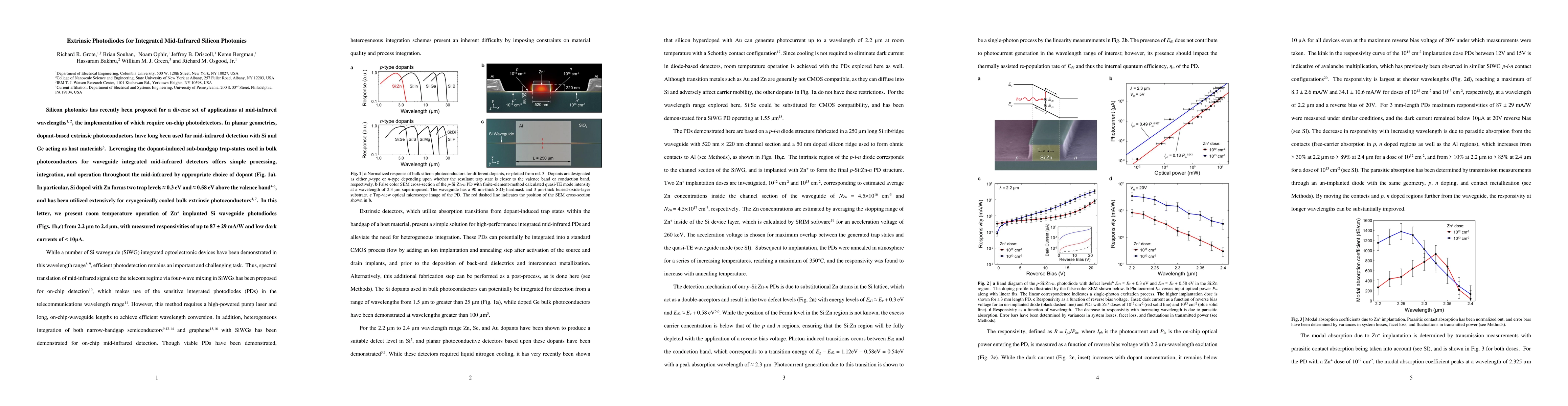 This paper details the successful implementation of extrinsic photodiodes made from Zn-implanted silicon waveguides for mid-infrared detection at room temperature. These photodiodes exhibit high responsivities up to 87 mA/W and low dark currents, enabling integration into silicon photonics systems.