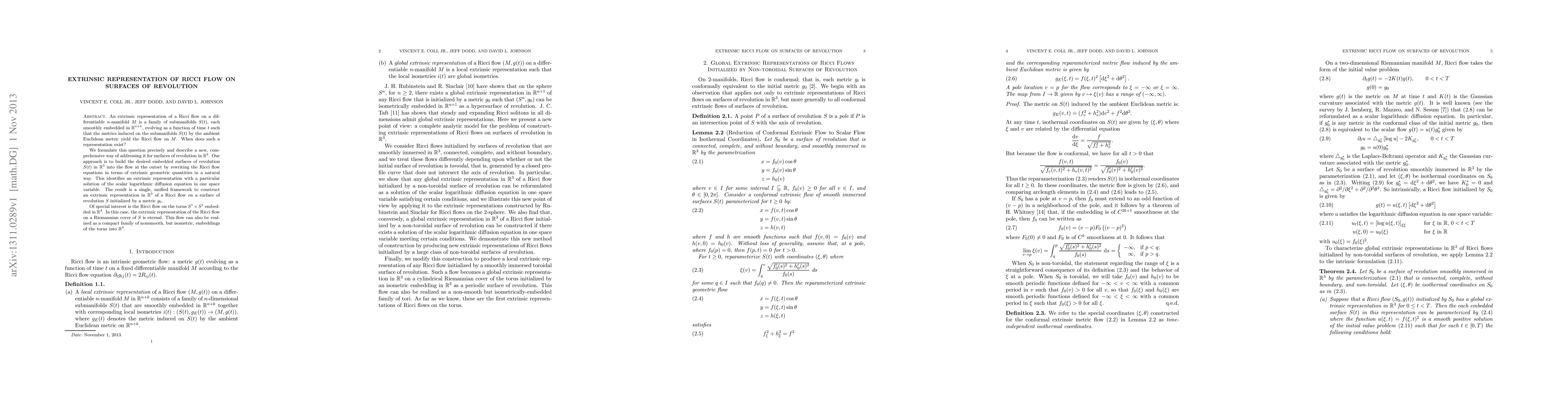 An extrinsic representation of a Ricci flow on a differentiable n-manifold M is a family of submanifolds S(t), each smoothly embedded in R^{n+k}, evolving as a function of time t such that the metrics induced on the submanifolds S(t) by the ambient Euclidean metric yield the Ricci flow on M. When does such a representation exist? We formulate this question precisely and describe a new, comprehensive way of addressing it for surfaces of revolution in R^3. Of special interest is the Ricci flow on a toroidal surface of revolution, that is, a surface of revolution whose profile curve is an immersed curve which does not intersect the axis of revolution. In In this case, the extrinsic representation of the Ricci flow on a Riemannian cover of S is eternal. This flow can also be realized as a compact family of non-smooth, but isometric, embeddings of the torus into R^3.