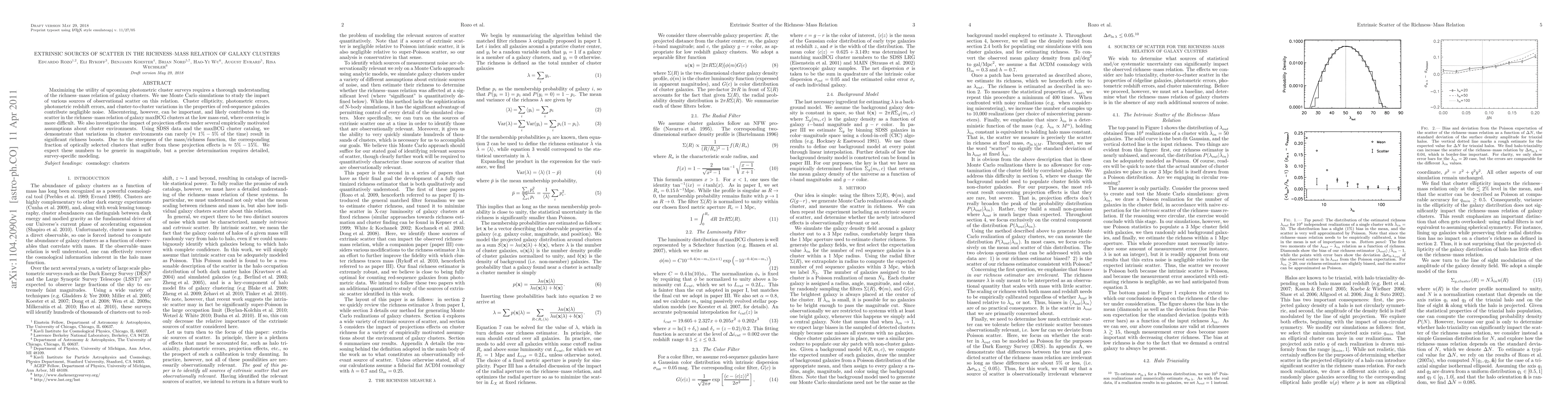 This paper investigates the extrinsic sources of scatter in the richness-mass relation of galaxy clusters, finding that miscentering contributes significantly at low masses, while cluster environment effects cause minor richness boosts in about 1%-5% of cases. The study uses Monte Carlo simulations and SDSS data to quantify these effects.