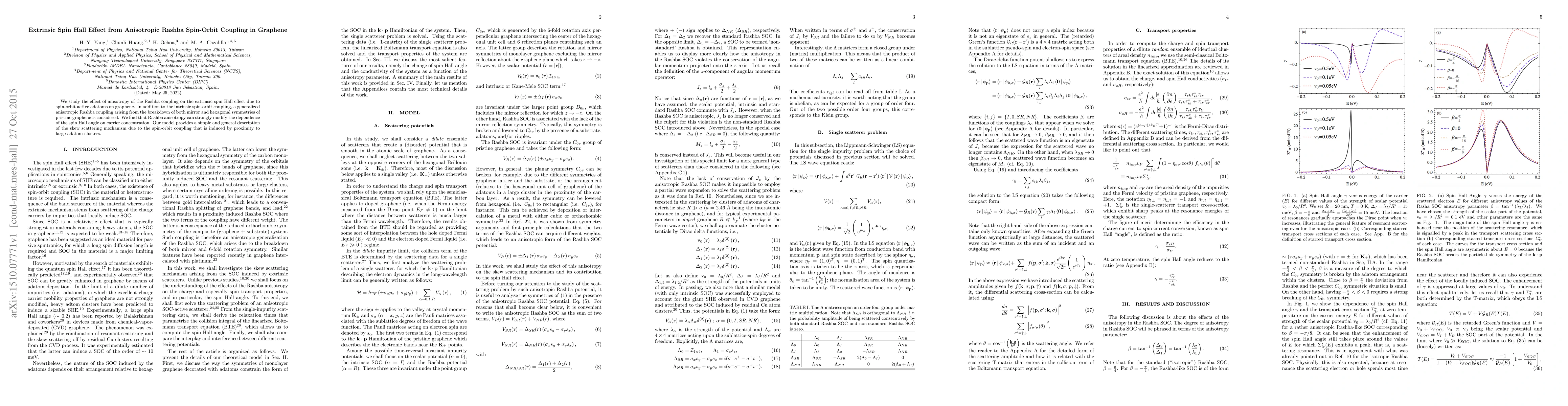 We study the effect of anisotropy of the Rashba coupling on the extrinsic spin Hall effect due to spin-orbit active adatoms on graphene. In addition to the intrinsic spin-orbit coupling, a generalized anisotropic Rashba coupling arising from the breakdown of both mirror and hexagonal symmetries of pristine graphene is considered. We find that Rashba anisotropy can strongly modify the dependence of the spin Hall angle on carrier concentration. Our model provides a simple and general description of the skew scattering mechanism due to the spin-orbit coupling that is induced by proximity to large adatom clusters.