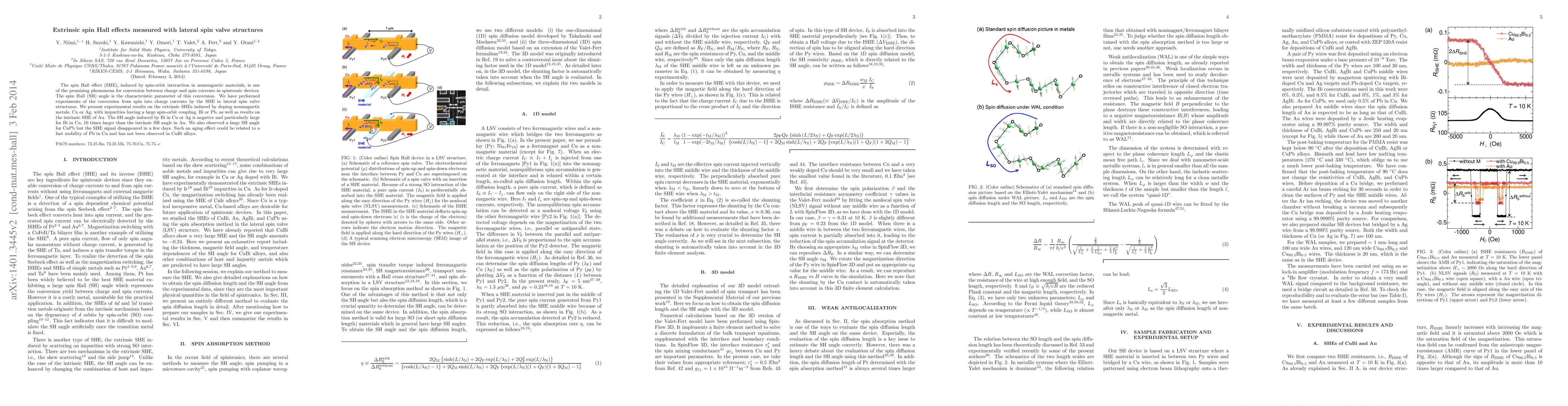 This paper investigates extrinsic spin Hall effects in lateral spin valve structures, demonstrating significant SHE induced by doping Cu or Ag with Bi or Pb. Notably, the SH angle for Bi in Cu is 10 times larger than that of intrinsic Au, while CuPb shows a large SH angle but exhibits an aging effect likely due to Pb mobility.