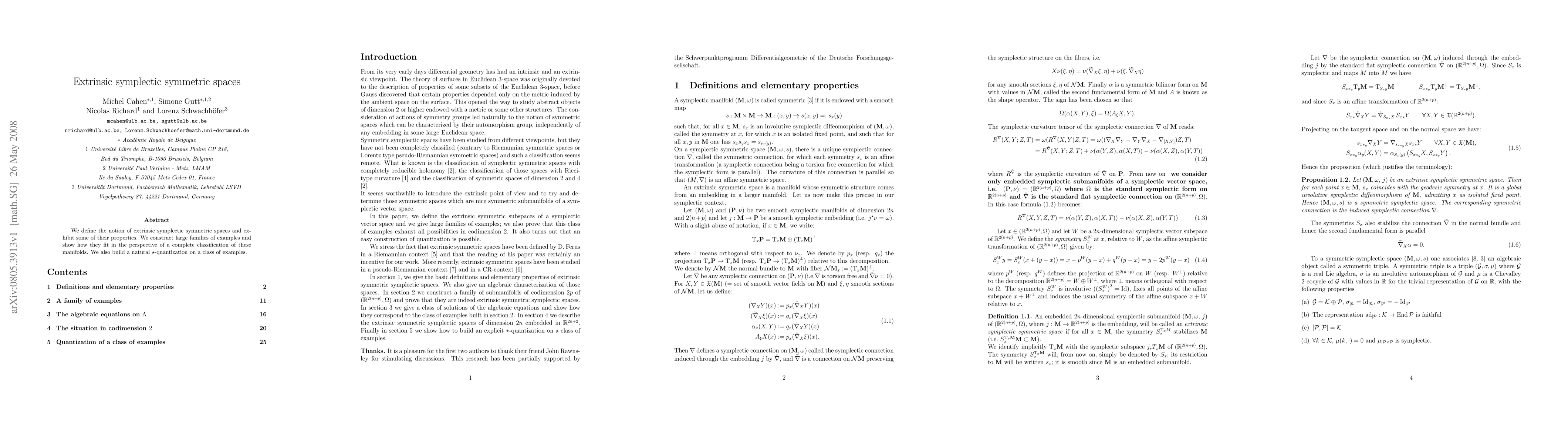 We define the notion of extrinsic symplectic symmetric spaces and exhibit some of their properties. We construct large families of examples and show how they fit in the perspective of a complete classification of these manifolds. We also build a natural star-quantization on a class of examples.
